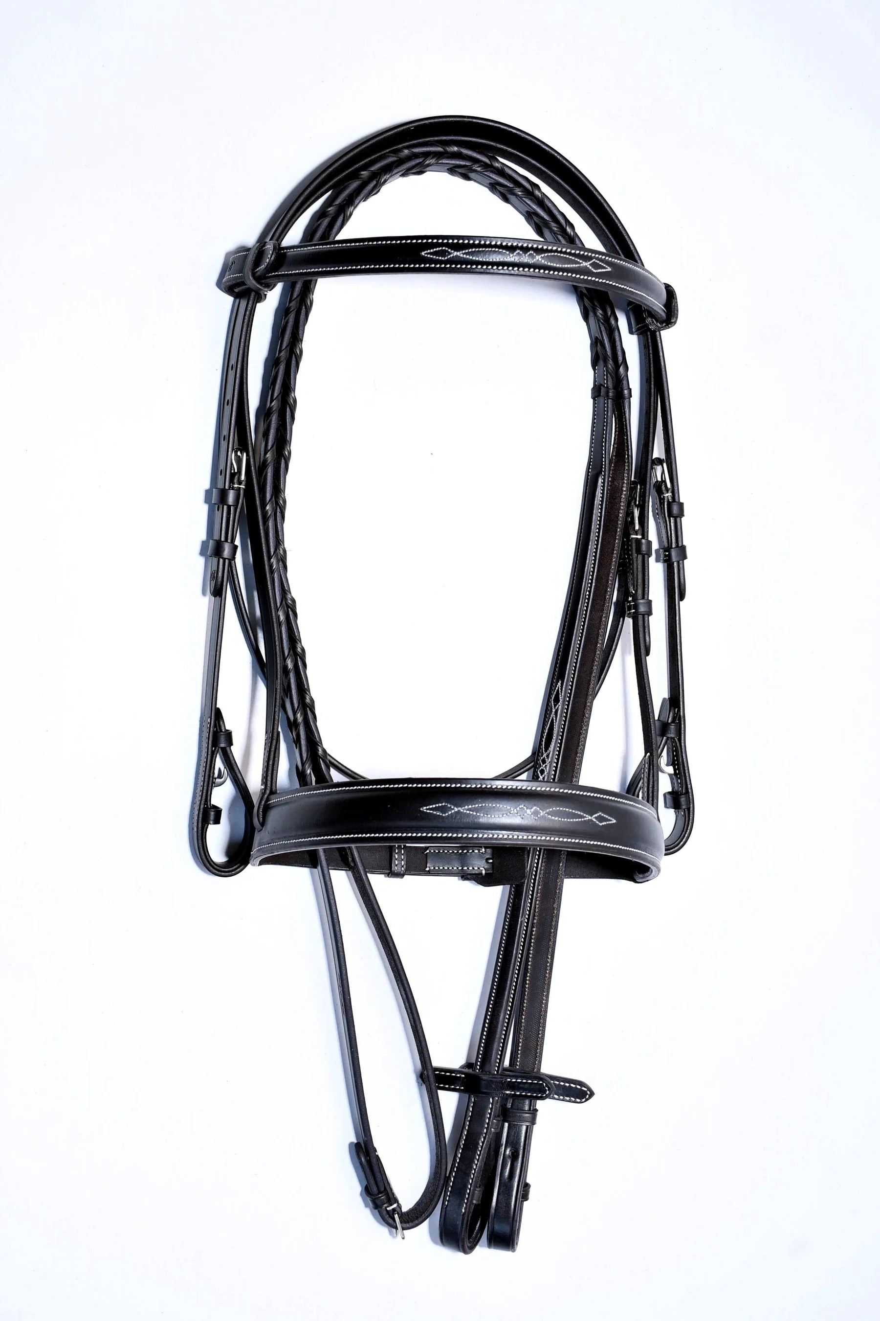 Bridleberry #30 Hunter Snaffle Full Grain Leather Bridle w/ White Stitched Design on Brow & Nosebands, White Stitched Laced Reins