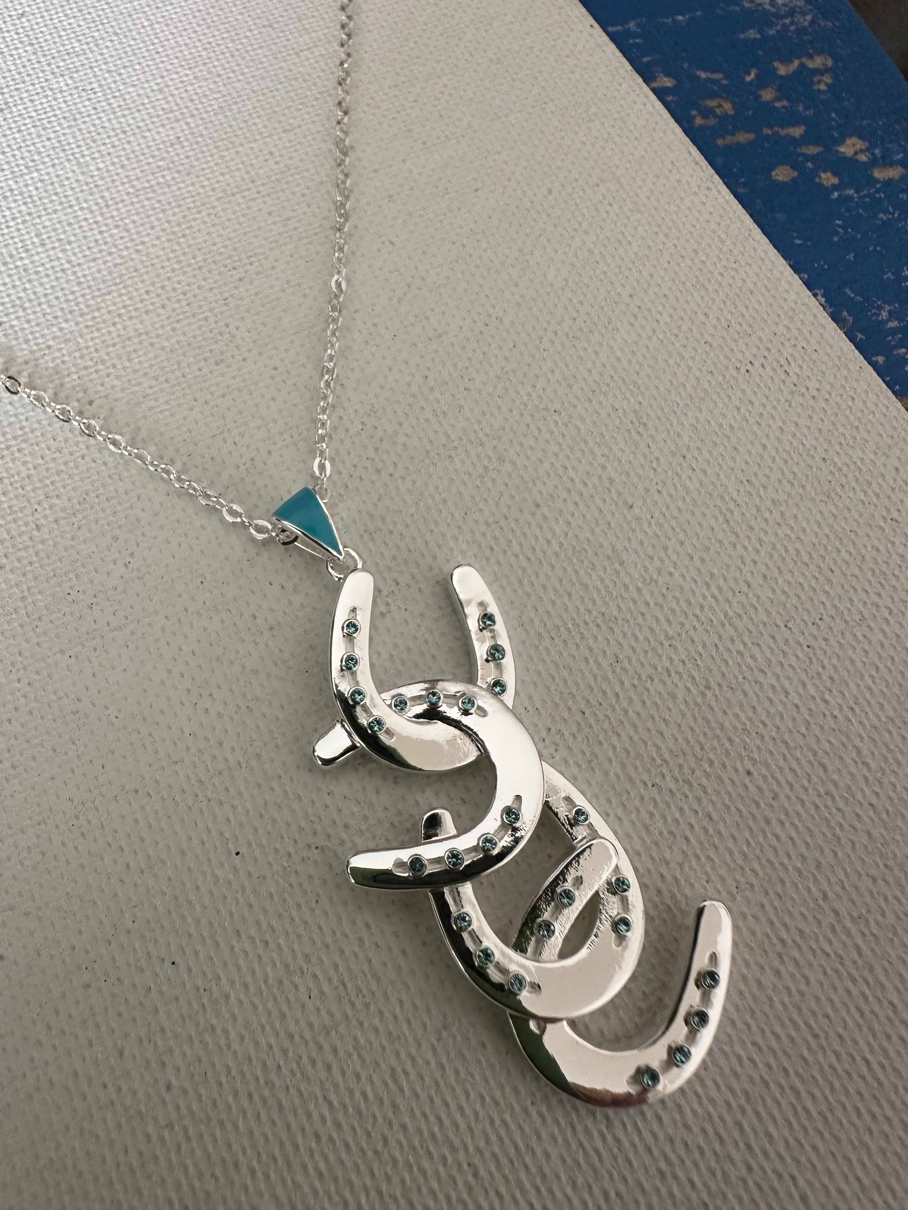 Four silver tone horseshoes, accented with aqua stones, dangle from a delicate, sparkly chain. The bezel at top...Regular price $28.99Sale price $28.99 Regular priceUnit price perSold out -