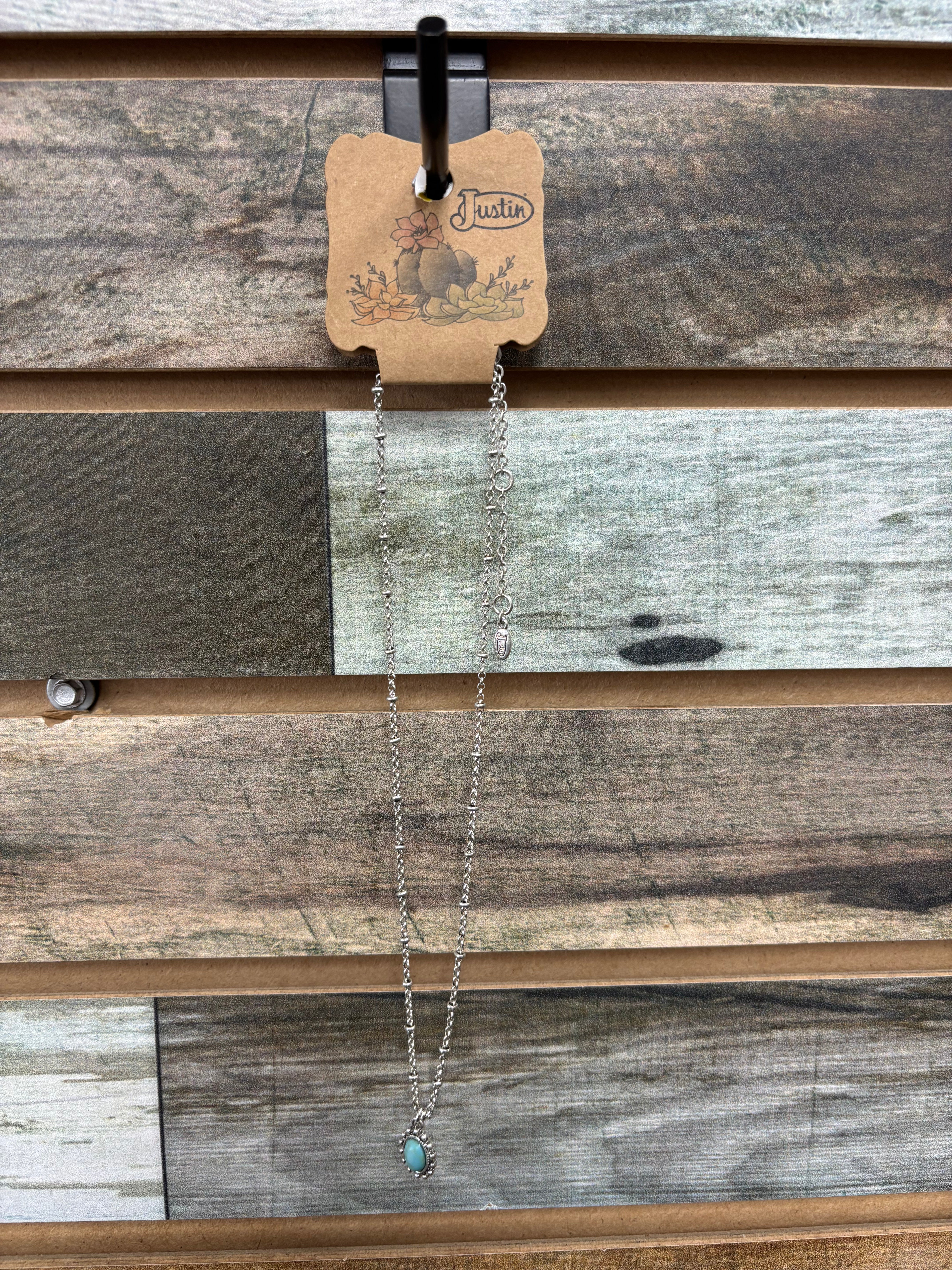 JUSTIN LADIES NECKLACE, OVAL FAUX TURQUOISE CHARM, ZINC ALLOY W/SILVER OX, 16" SATURN CHAIN WITH 2.5 EXTENTION CHAINRegular price $13.99Sale price $13.99 Regular priceUnit price per -