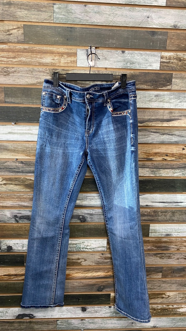 USED Grace Straight Cut Jeans with Western Style Embroidery on Back Pockets 32 Jean