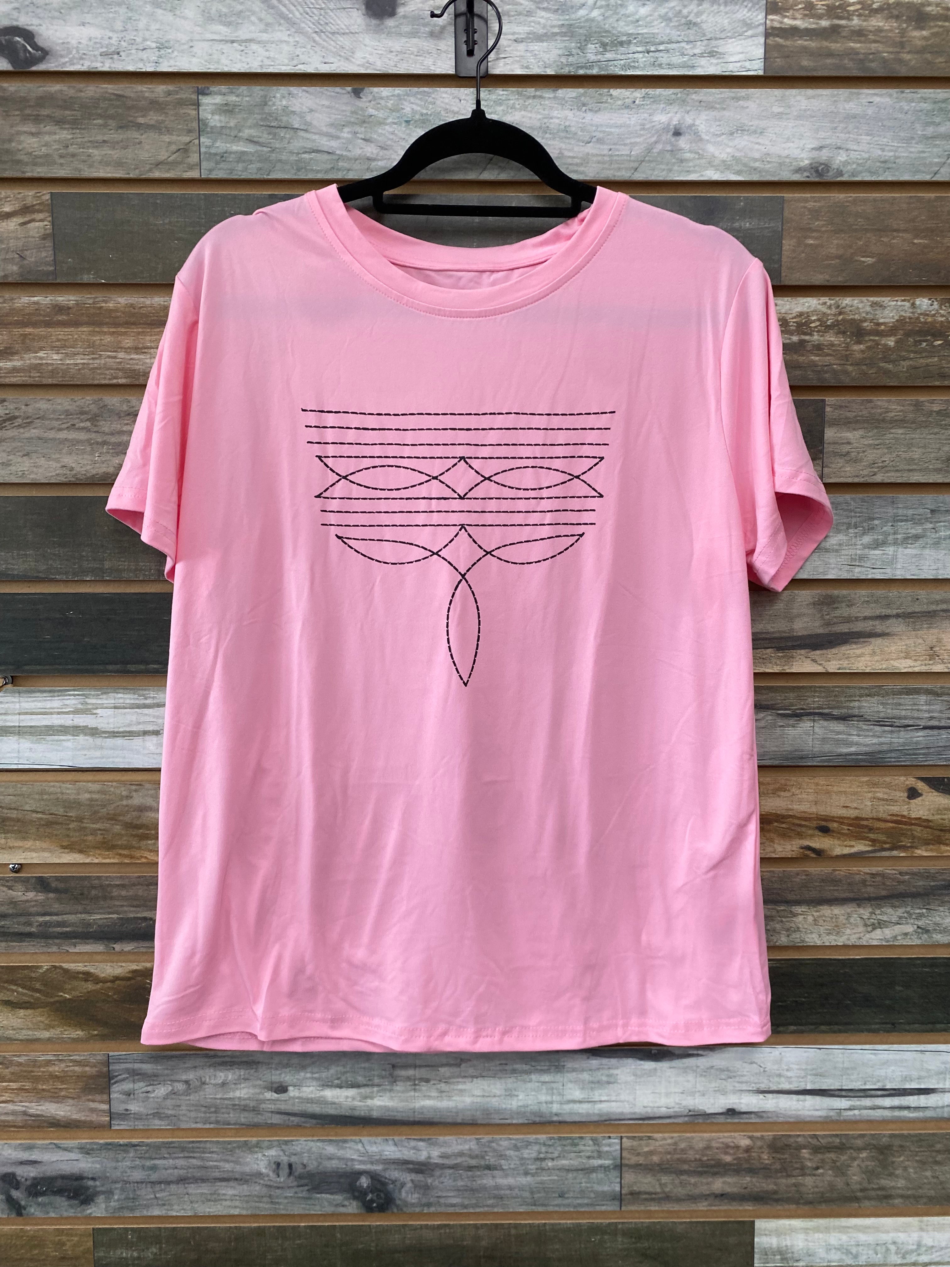 Loose pink t-shirt with a boot stitch pattern printed on.Regular price $16.99Sale price $16.99 Regular priceUnit price per -