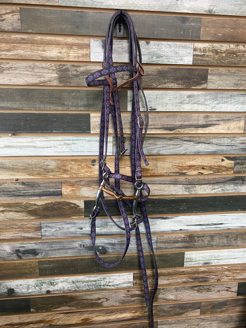 Nylon Browbnad Headstall with Bit and Split Reins. Bit: Tom Thumb 5" Colors: Black, Purple, And Blue Aztec...Regular price $30.00Sale price $30.00 Regular priceUnit price per -