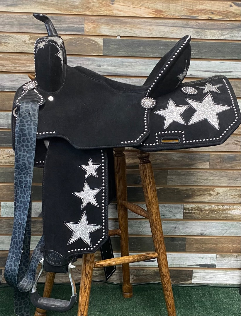 15" MOUSM Black W/ Silver Glitter Stars Barrel Saddle Details: Silver Glitter Stars with Silver Rivet Detailing 15"...Regular price $775.00Sale price $775.00 Regular priceUnit price per -