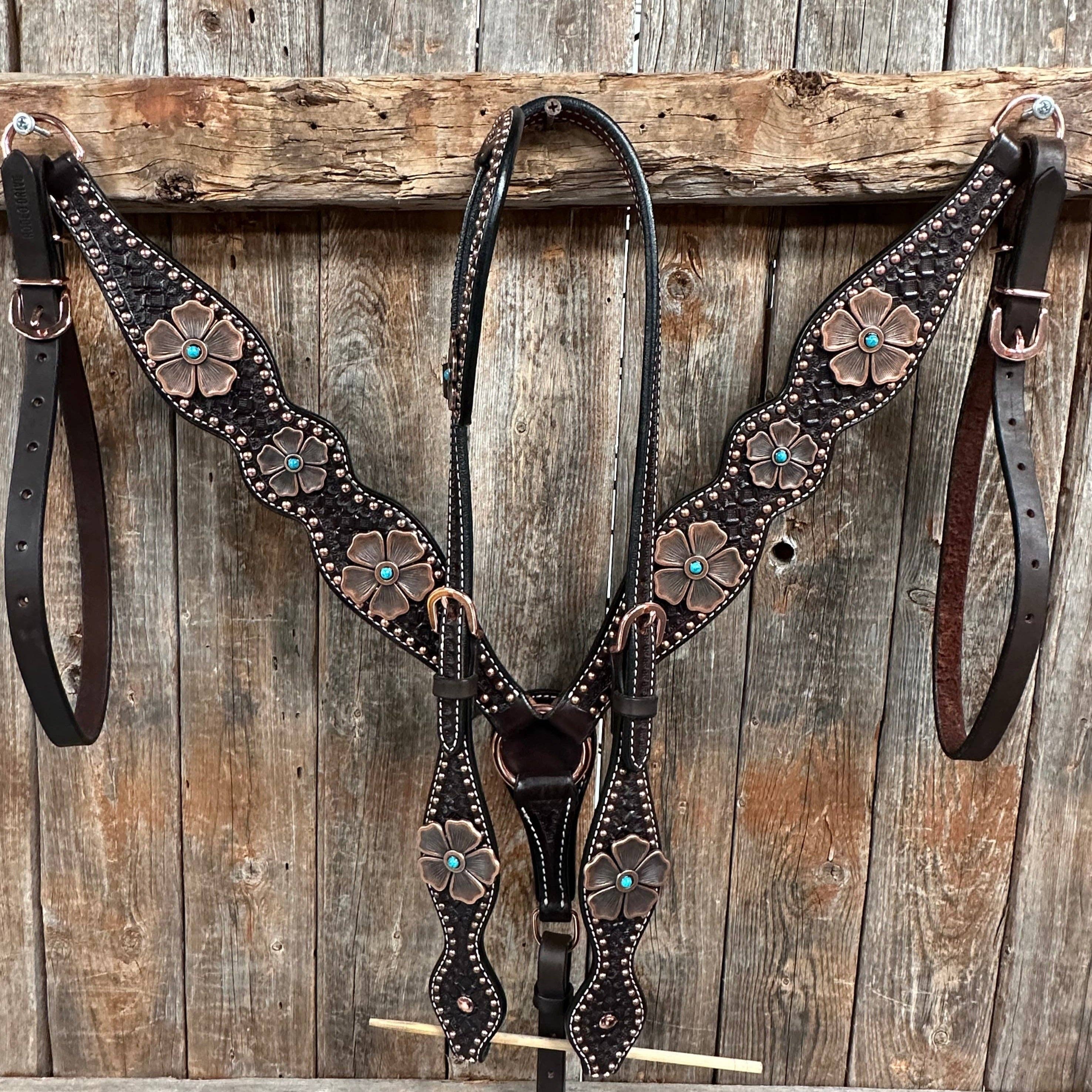 Browband, one ear and breast collar is dark oil with copper dots. They are decorated with copper flower...Regular price $374.00Sale price $374.00 Regular priceUnit price per -