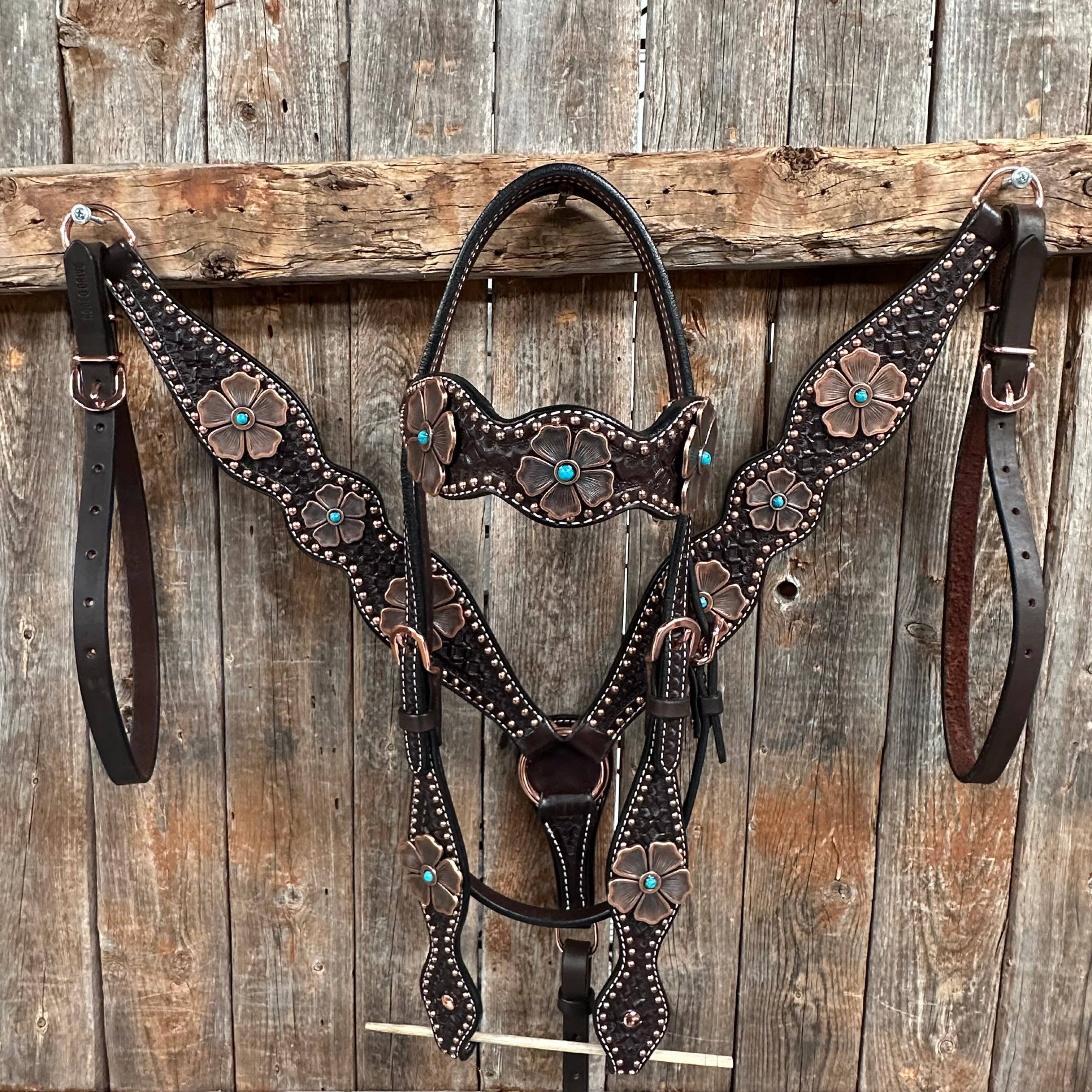Copper Dot Honeycomb Flower and Turquoise Browband / One Ear Tack Set