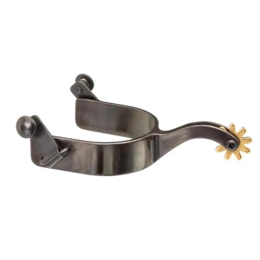 These black steel spurs feature attractive silver overlay scrolling on band and shank. Buttons feature beautiful flower detail....Regular price $58.99Sale price $58.99 Regular priceUnit price per -