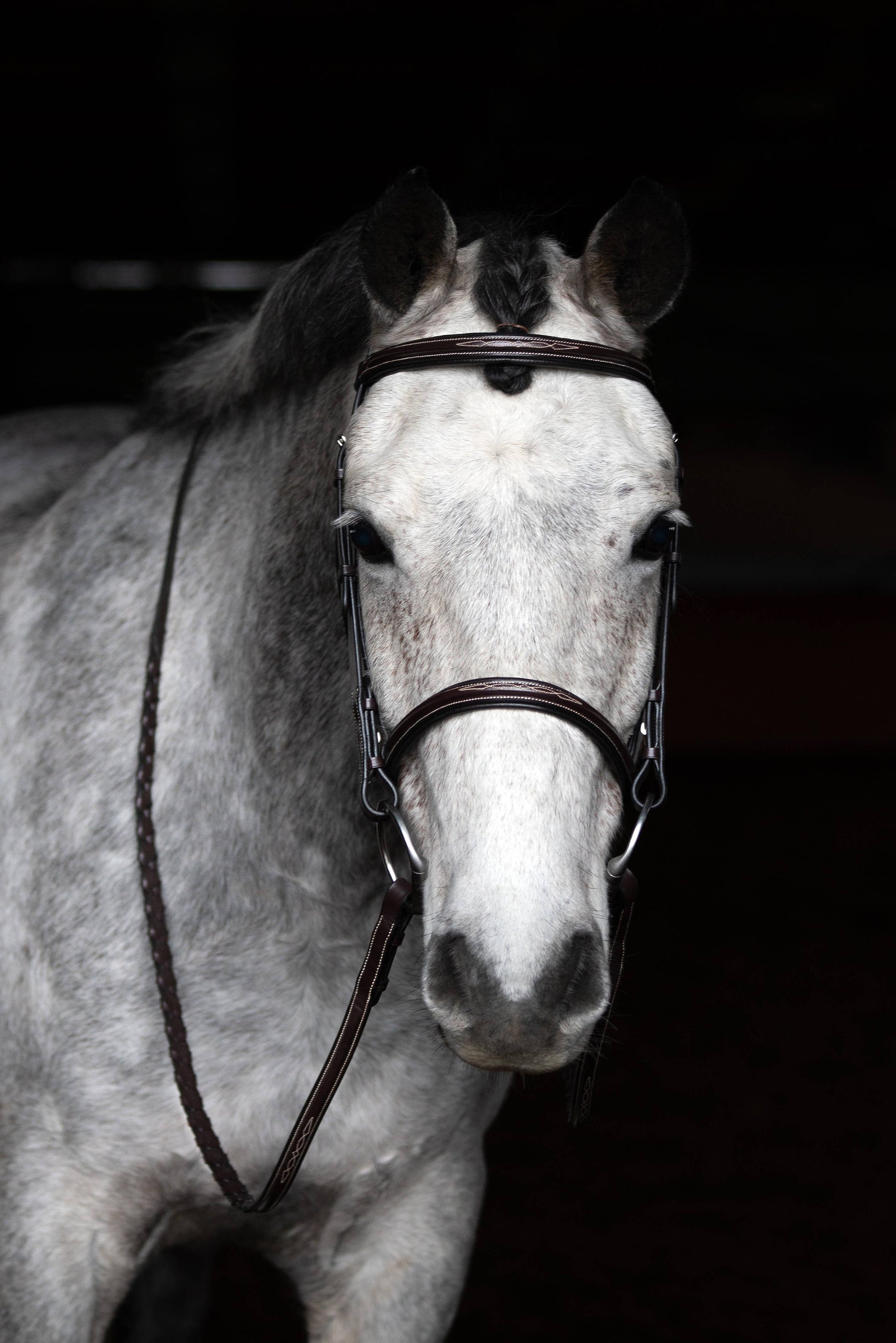 The Arnold IV bridle will complement your horse's head for the hunter jumper ring or everyday arena work with style. This square raised bridle is made with soft, top-quality leather with extra fine contrast stitching. The inlaid crown, browband, and noseband are padded for your horse's comfort. Crafted with soft, top-quality leather featuring elegant contrast stitching detail and stainless-steel hardware, our Arnold IV bridle will be your go-to bridle for years to come. Includes raised laced reins with matching details.