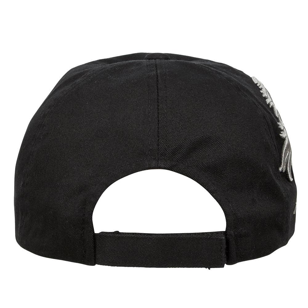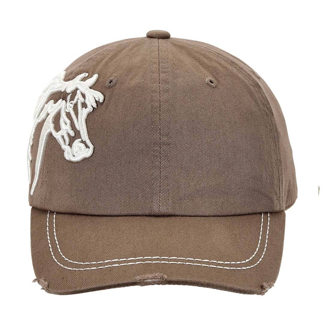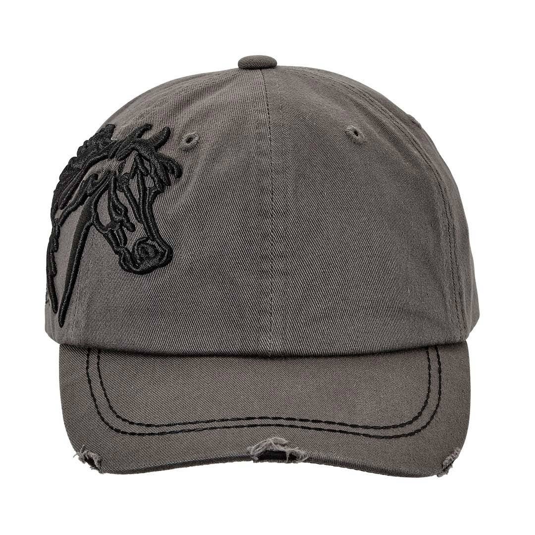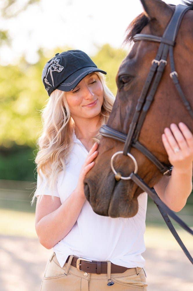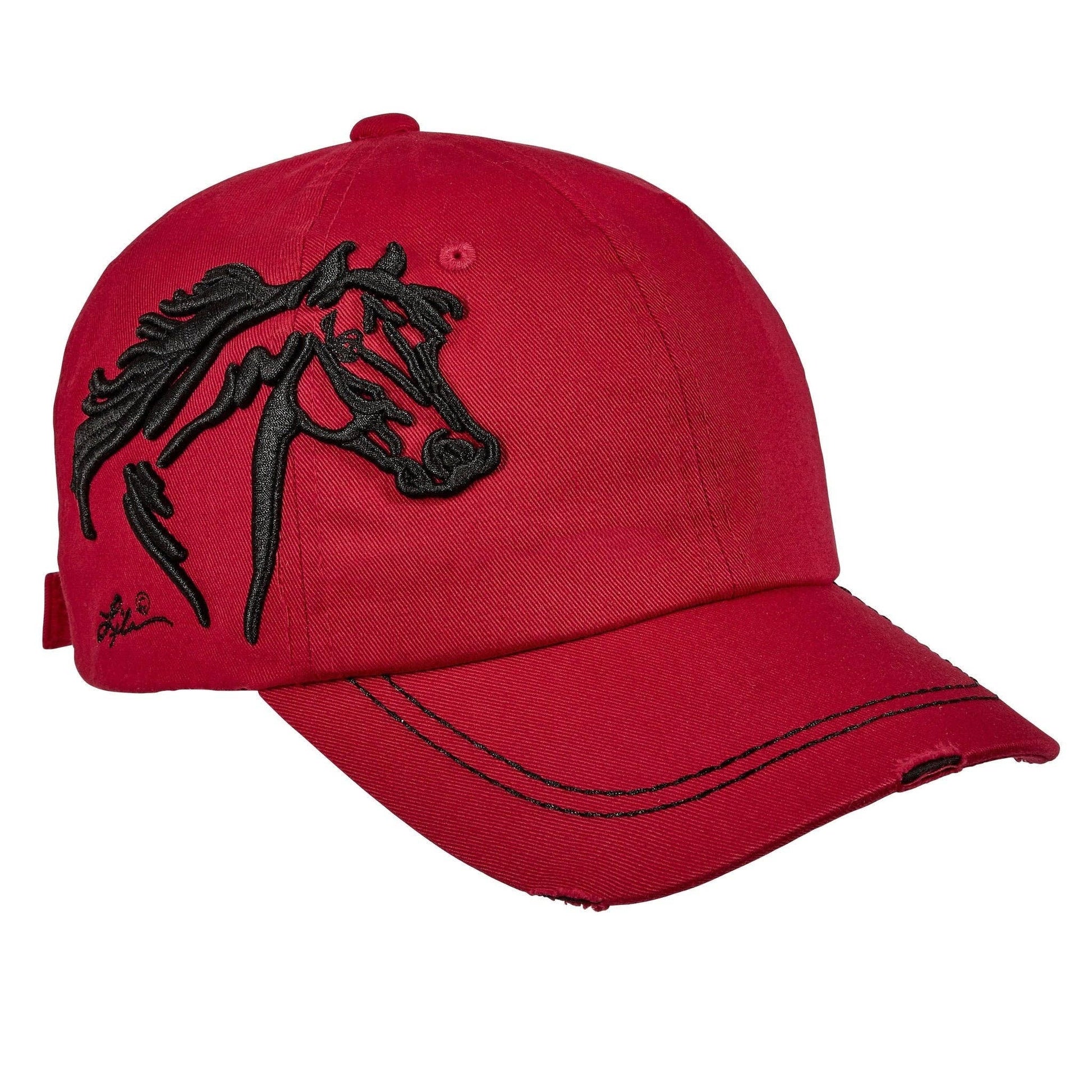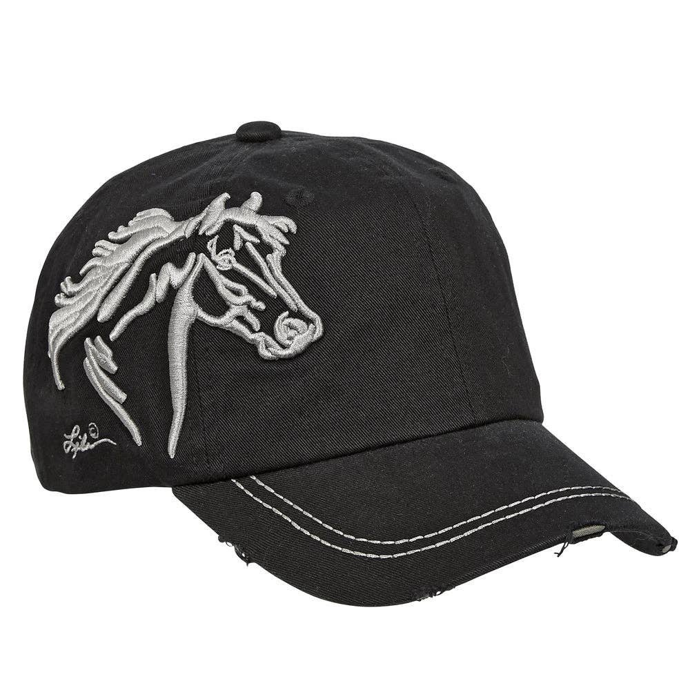 Lila© Signature cap with beautifully embroidered horse head. Six panel construction with ventilation eyelets, contrast stitching and distressed brim. Adjustable hook-and-loop back strap. One size fits most.