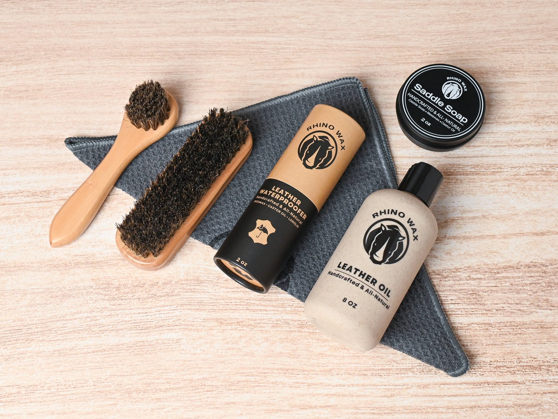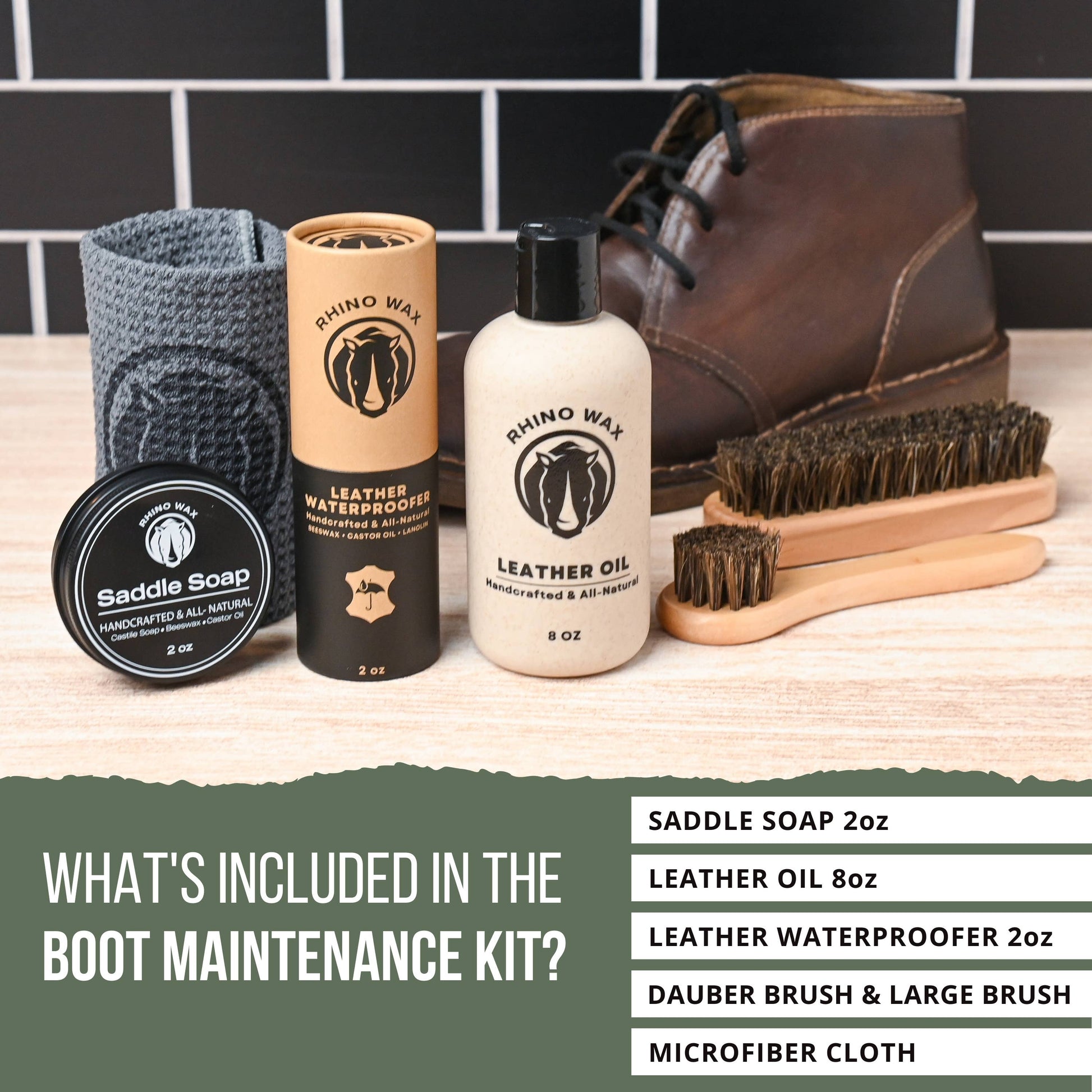 Rhino Wax Boot Maintenance Kit includes Saddle Soap, Leather Oil, Waterproofer, Horsehair Brushes and a Microfiber Cloth to clean, condition, waterproof, and maintain your boots for years to come.