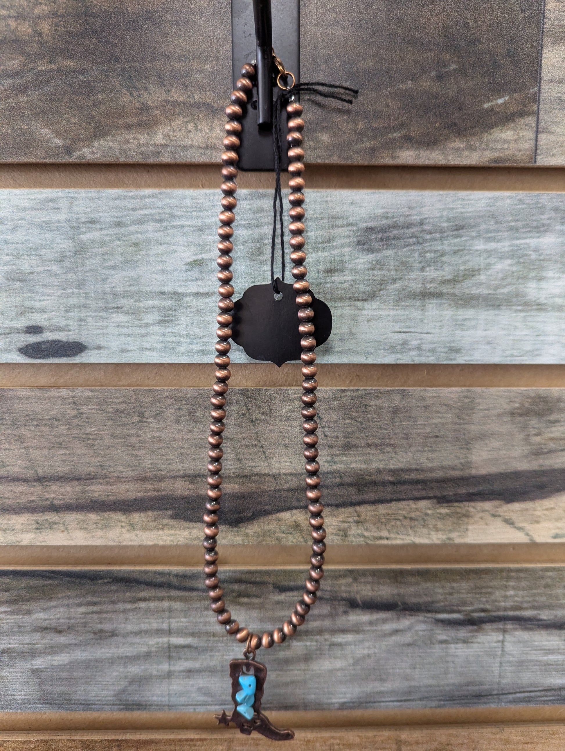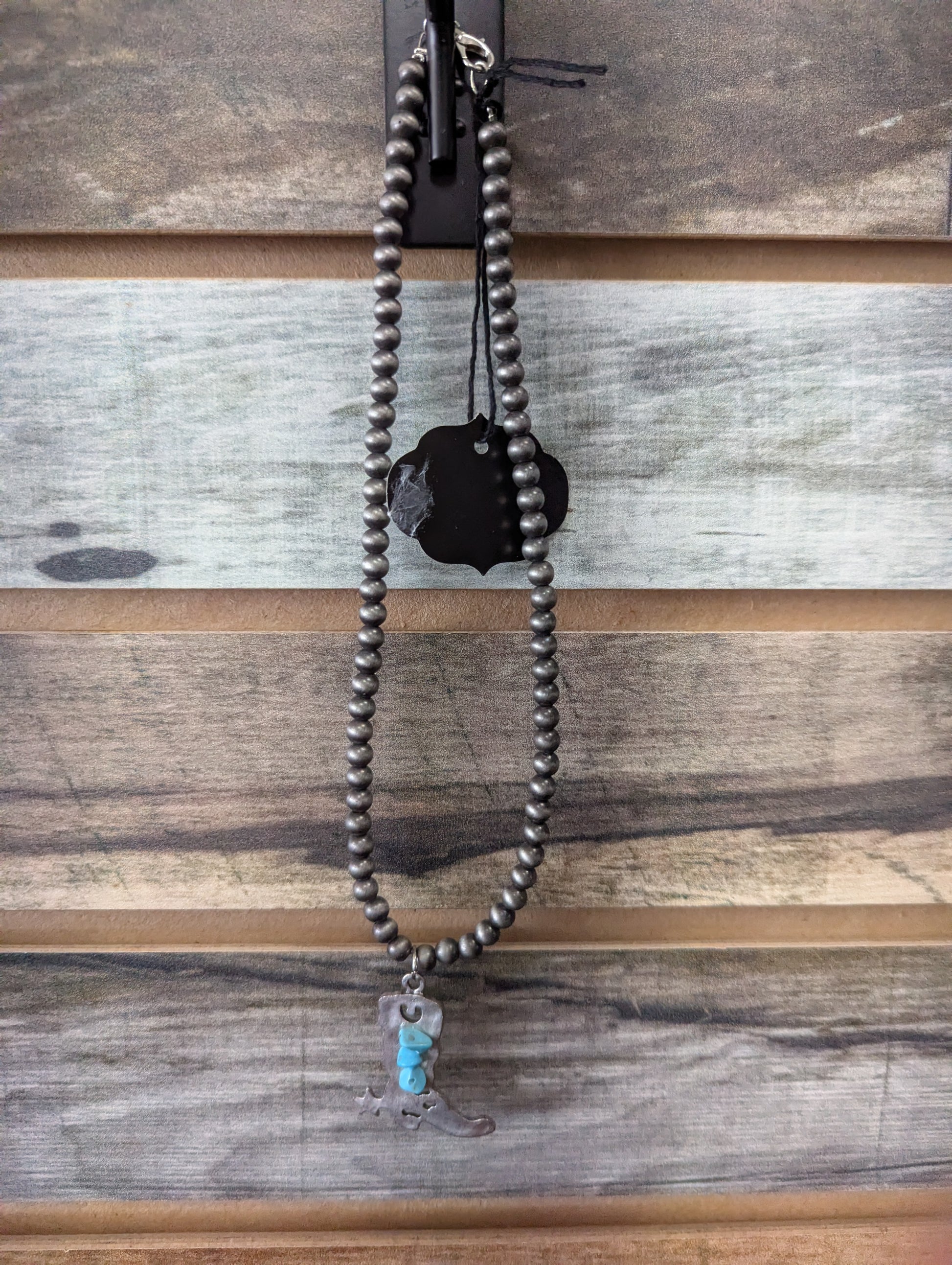 Beaded necklace with turquoise boot pendant, available in gray or copper beading.