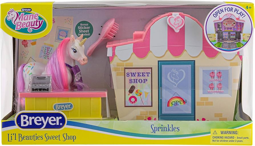 Li'l Beauties Shimmer Grooming Salon and Sprinkles Sweet Shop from the Breyer Mane Beauties collection are adorable horse playsets with accessories. They are perfect for kids who love styling hair and bringing the fun with them wherever they go. The Shimmer Grooming Salon and Sprinkles Sweet Shop are from the Breyer Mane Beauties collection.