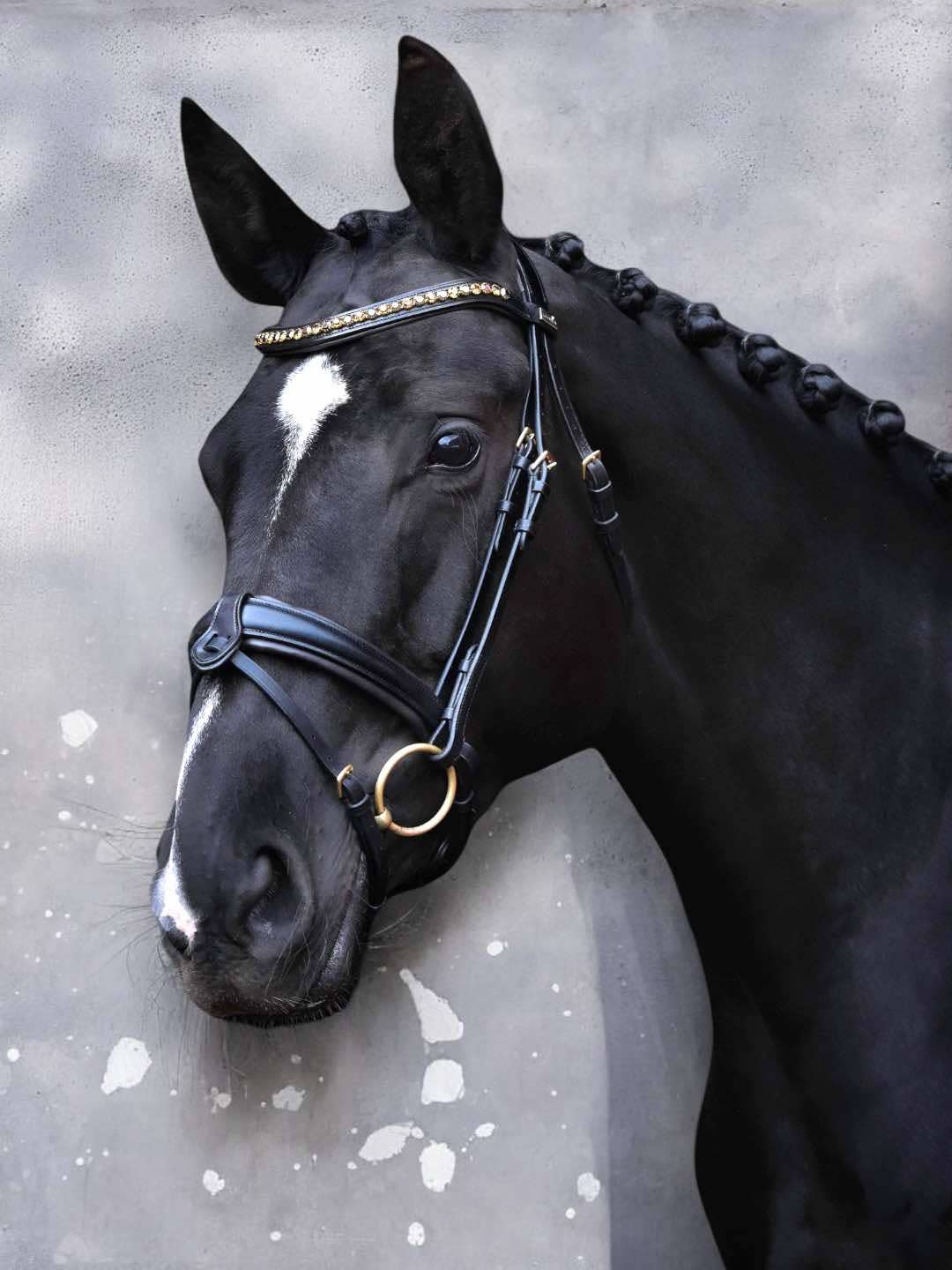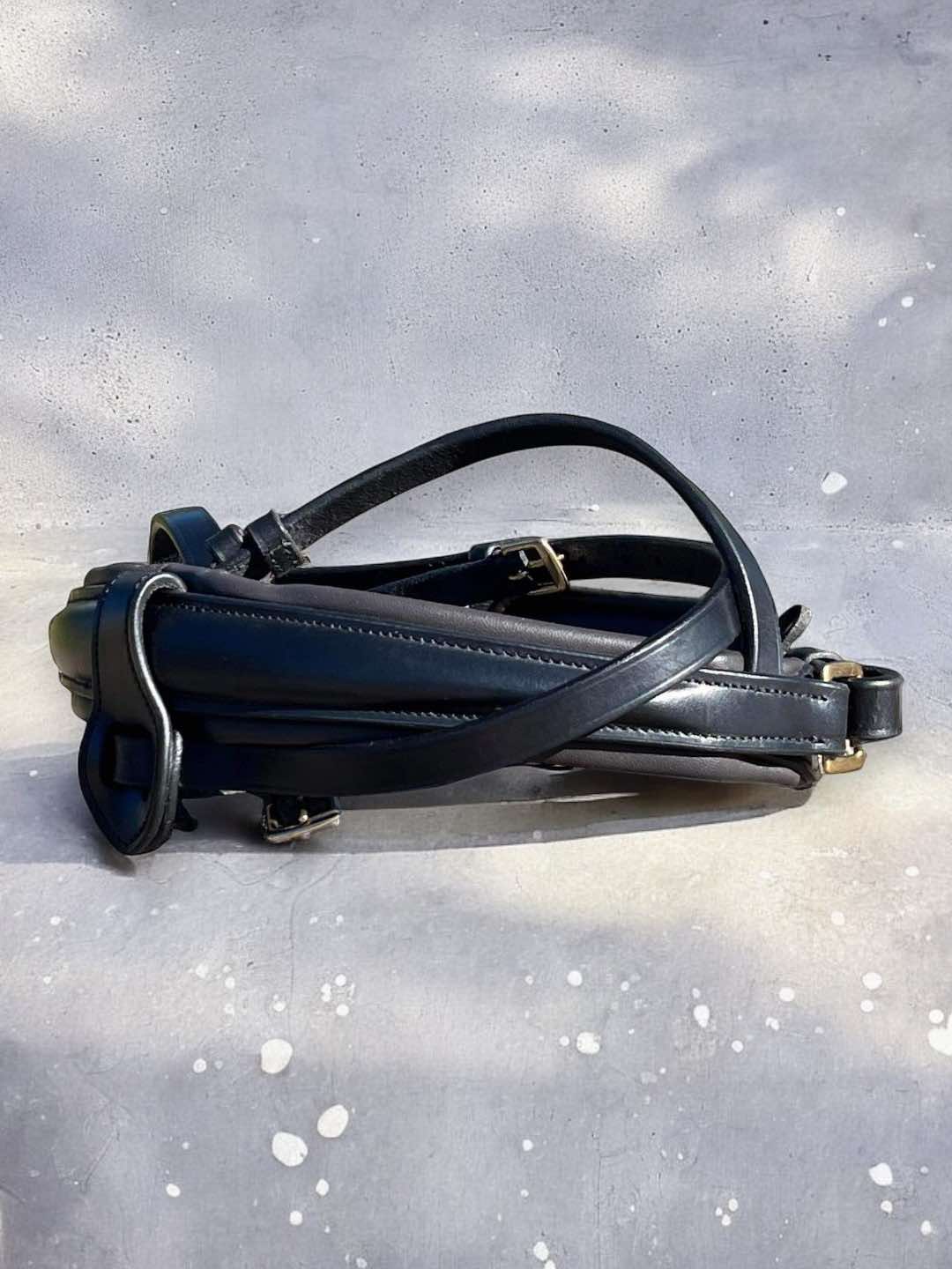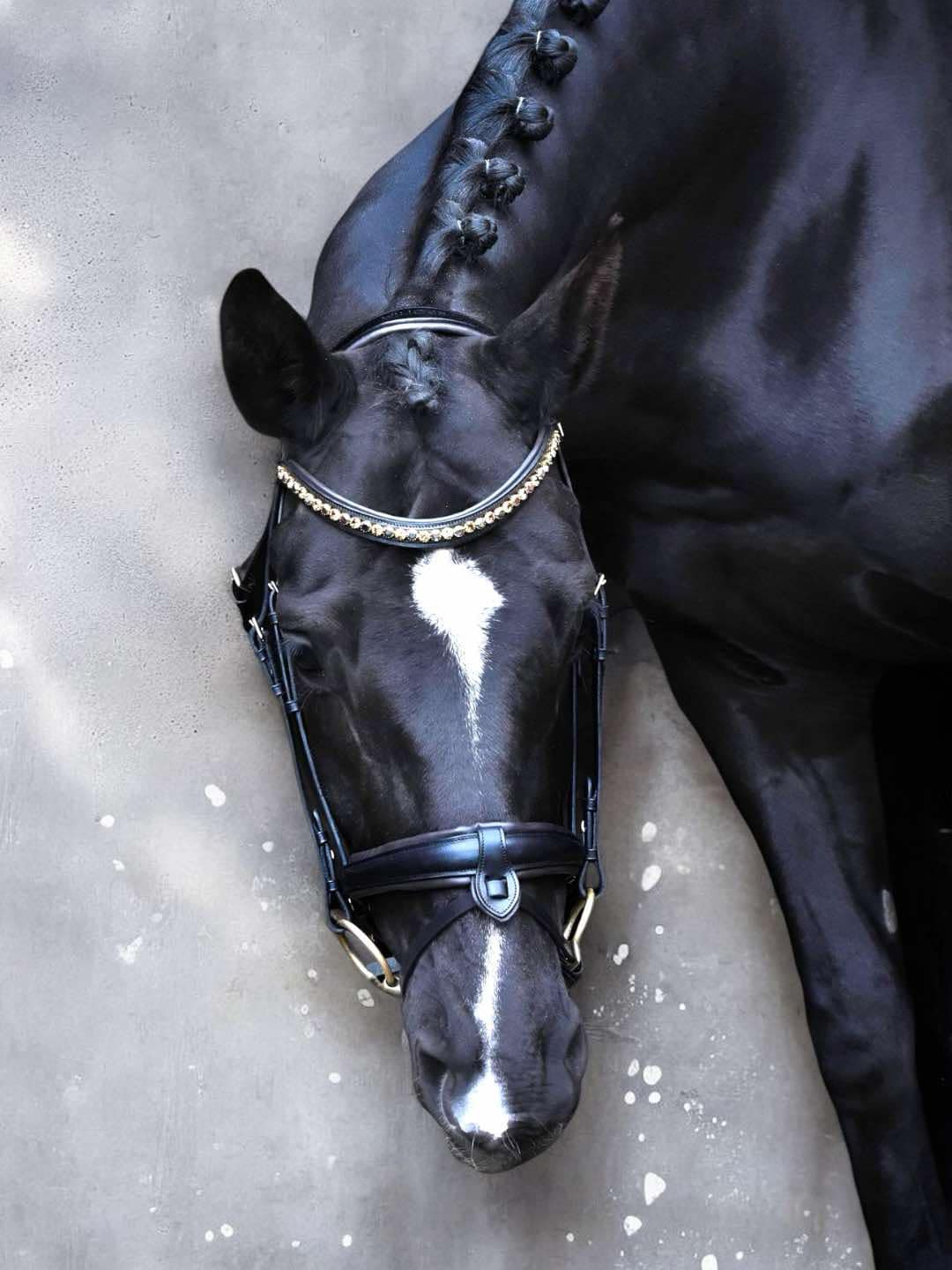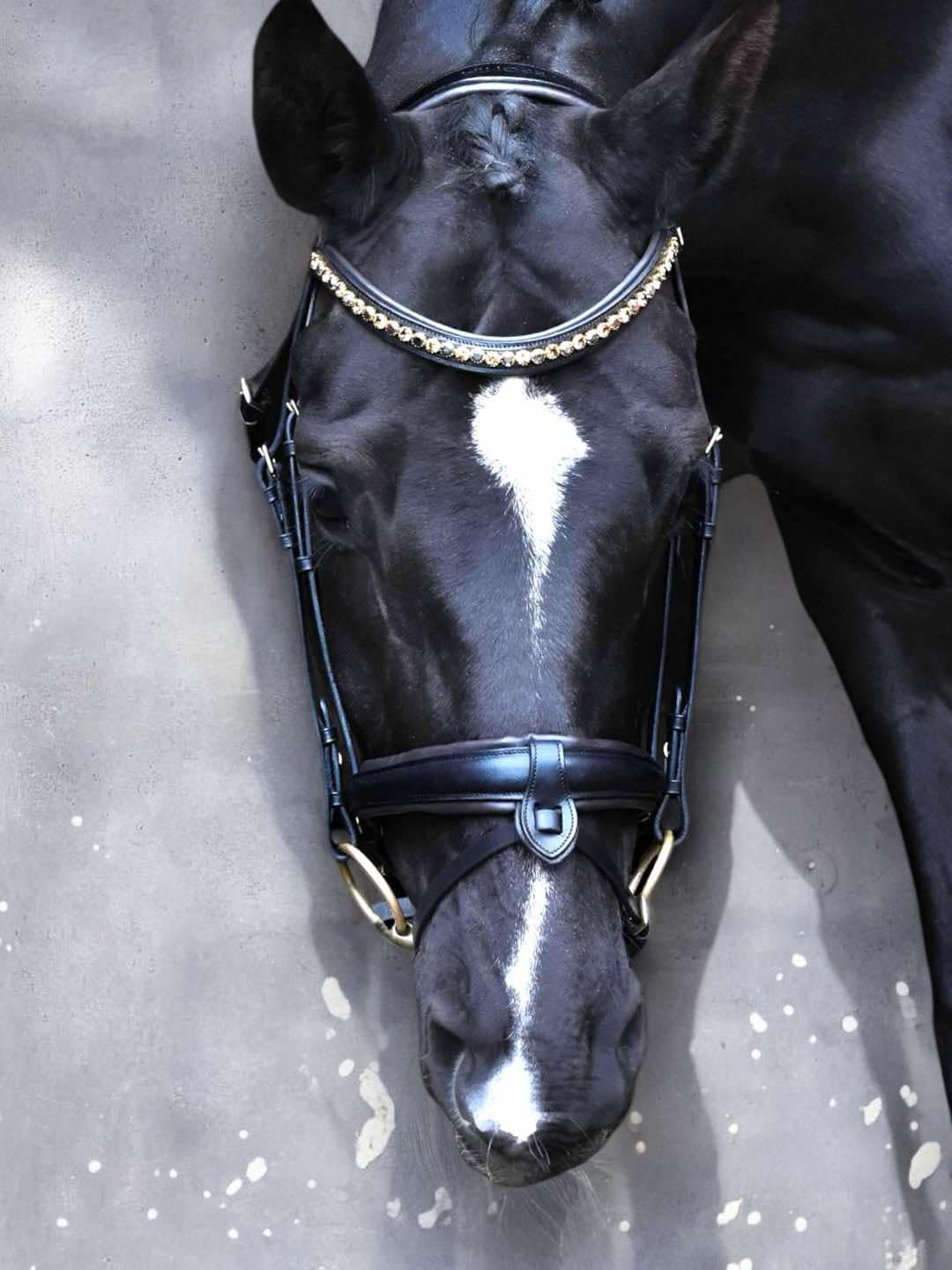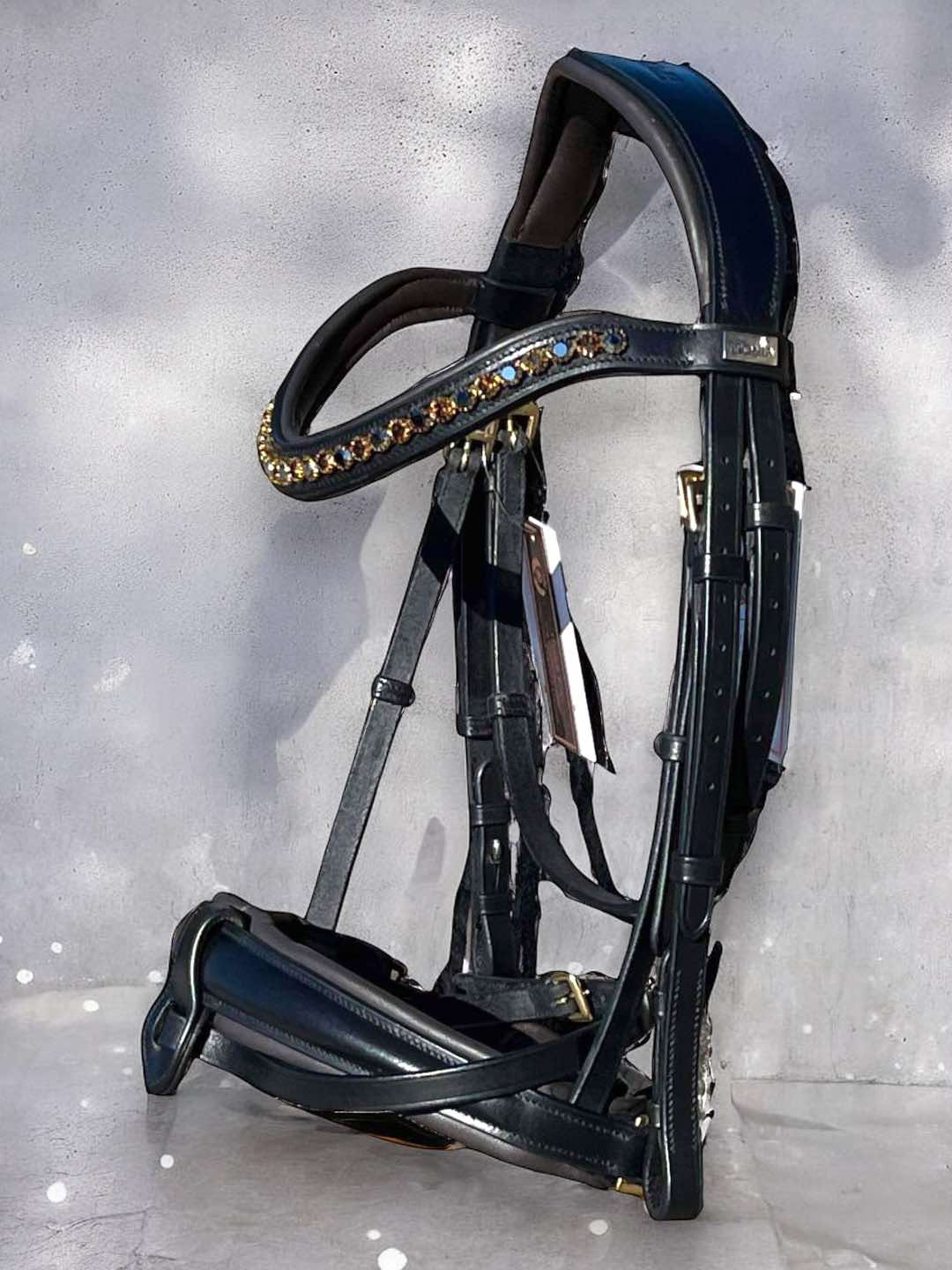 The bridle’s fittings are made from stainless steel with a gold-plated finish, enhancing its elegance and durability.