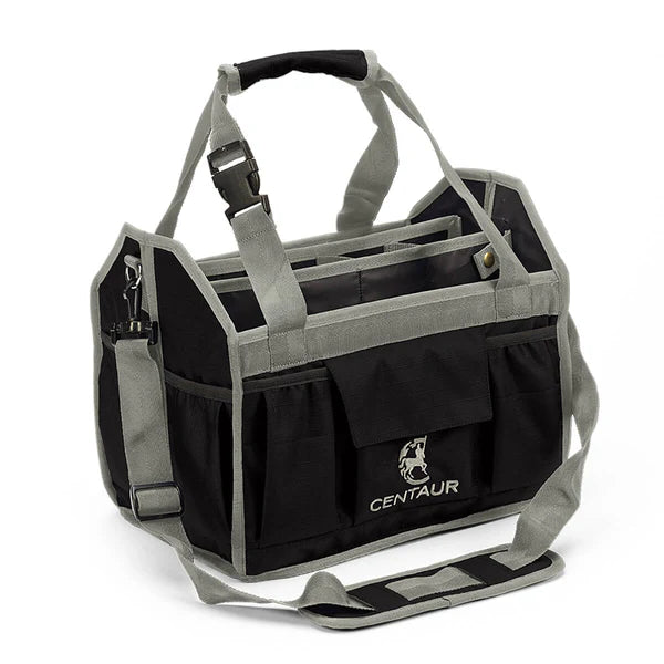 Waterproof-breathable grooming essentials tote boasts many compartments to keep all your tools organized, plus a mesh bottom to allow dust and liquids to fall through. Snap-in middle insert allows the tote to fully collapse flat for storage. Features carry handles with an easy-clip for hanging, and detachable, adjustable, and padded shoulder strap. Dimensions: 10” tall x 12” wide x 15” long