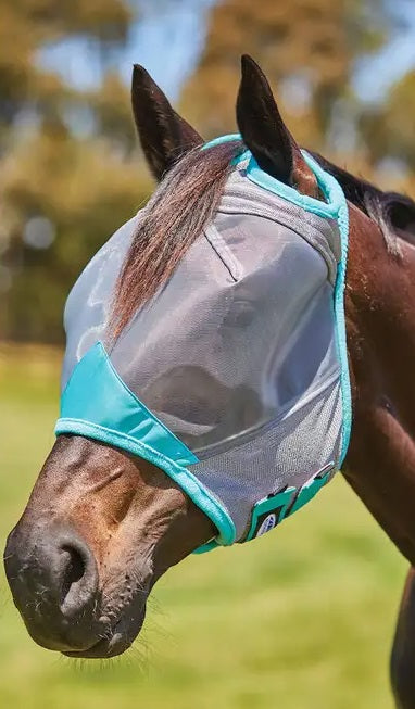 Designed with vision, comfort and durability in mind. This mesh mask is made to protect in summer. The fine mesh allows for full vision and protection from smaller insects with double darts for a superb fit and adjustable double touch tape tabs for ease of use. Soft fleece binding and hole to pull forelock through for additional comfort with stretch fleece poll for a secure and comfortable fit. Offering 60%+ UV Block. Mesh: 100% polyester. Bindings: 100% polyester.