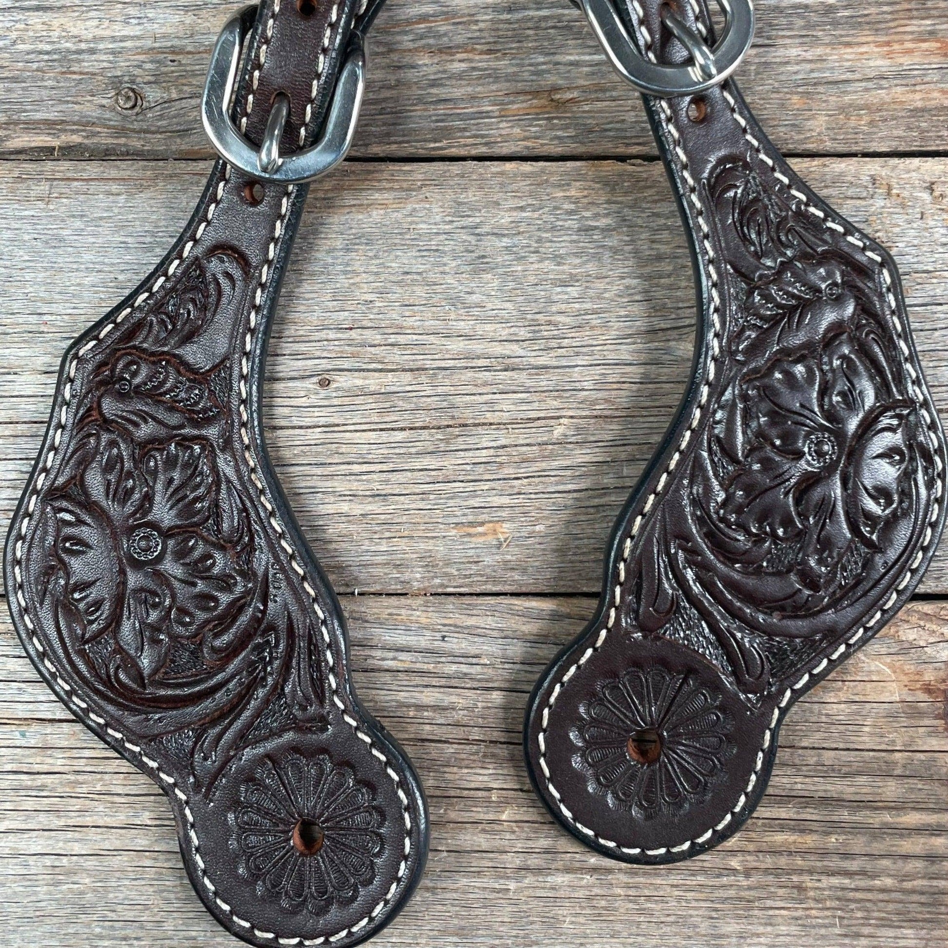 Dark Oil Genuine Leather Floral Tooled Spur Straps