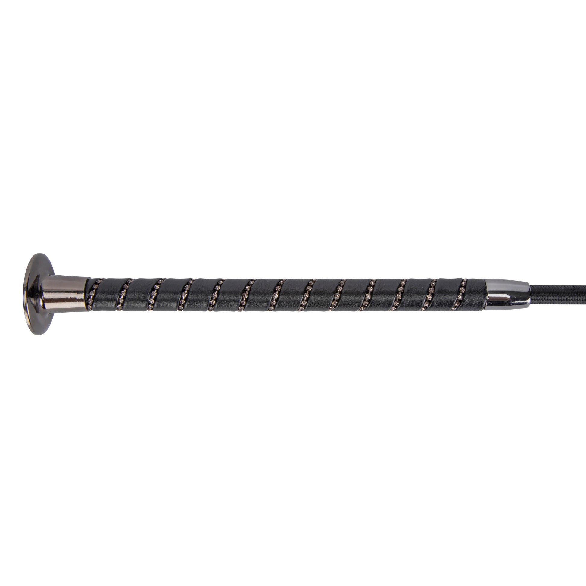 The deluxe schooling whip combines performance with refined style. An embedded diamante detail at the handle is beautifully complemented by a black faux leather wrap, creating a sophisticated look. An elegant silver-colour mushroom top and matching lower band complete the design.