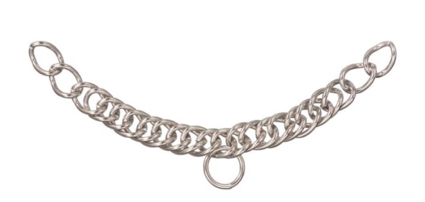 Full length English style curb chain made of durable stainless steel. Flat dual links help to minimize pinching when rein pressure is applied. Adjustable, works well with kimberwicke or pelham style bits. Does not include curb hooks.