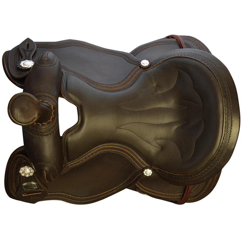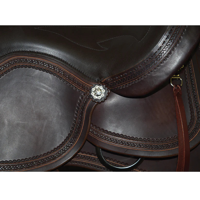 Built with American Steer hides, Stainless Steel Dees, In-skirt riggings, Contoured Skirt, turned fenders, rope border tooling, hand stitched cantle, berry conchos and a host of other great features make this highly desirable for today’s discerning Trail Rider. This saddle is available in Mahogany color. The double padded and stitched Top Grain leather seat, polished leather edging, and saddle strings give this saddle a very good finished appearance.