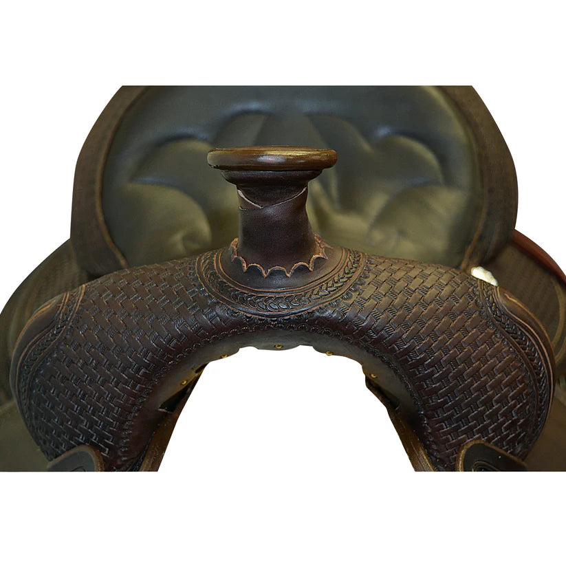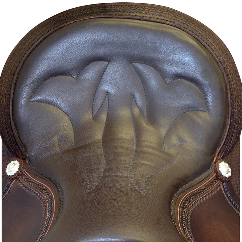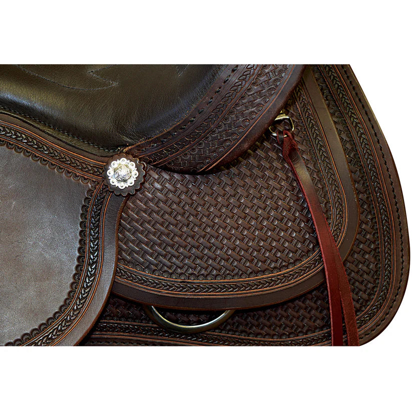Built with American Steer hides, Stainless Steel Dees, In-skirt riggings, Contoured Skirt, turned fenders, Basket weave with rope border tooling, hand stitched cantle, berry conchos and a host of other great features make this highly desirable for today’s discerning Trail Rider. This saddle is available in Mahogany color. The double padded and stitched Top Grain leather seat, polished leather edging, and saddle strings give this saddle a very good, finished appearance.