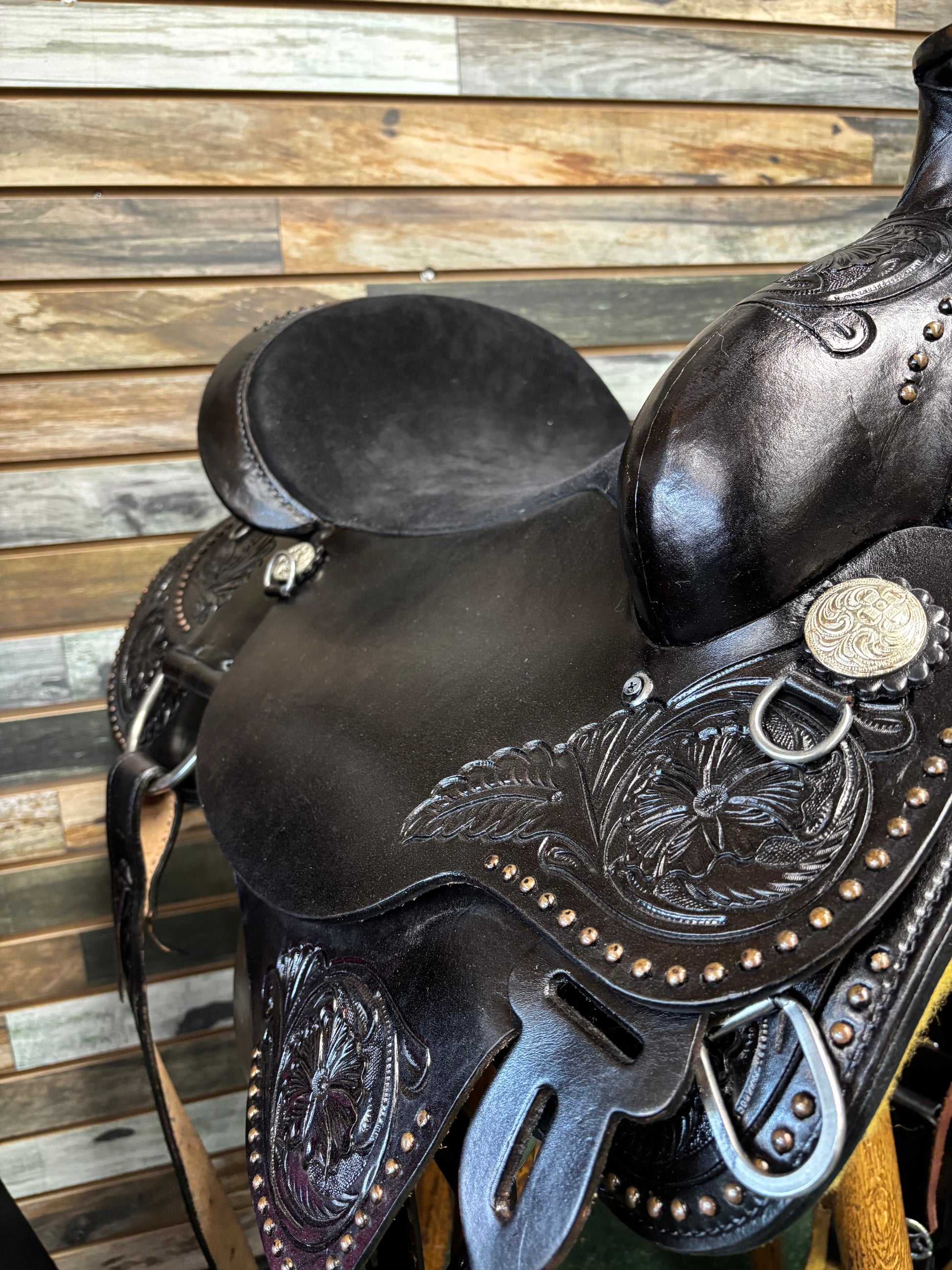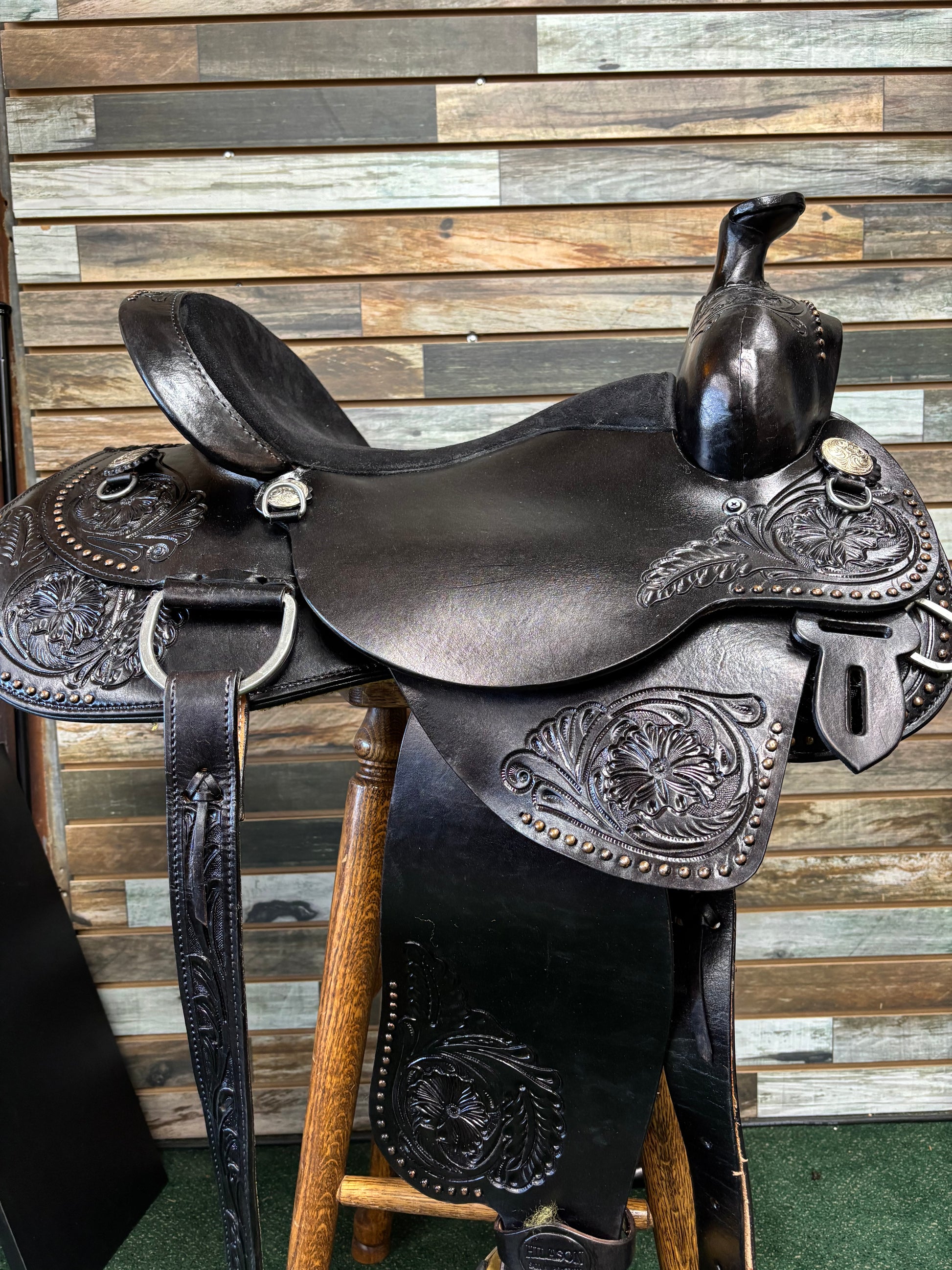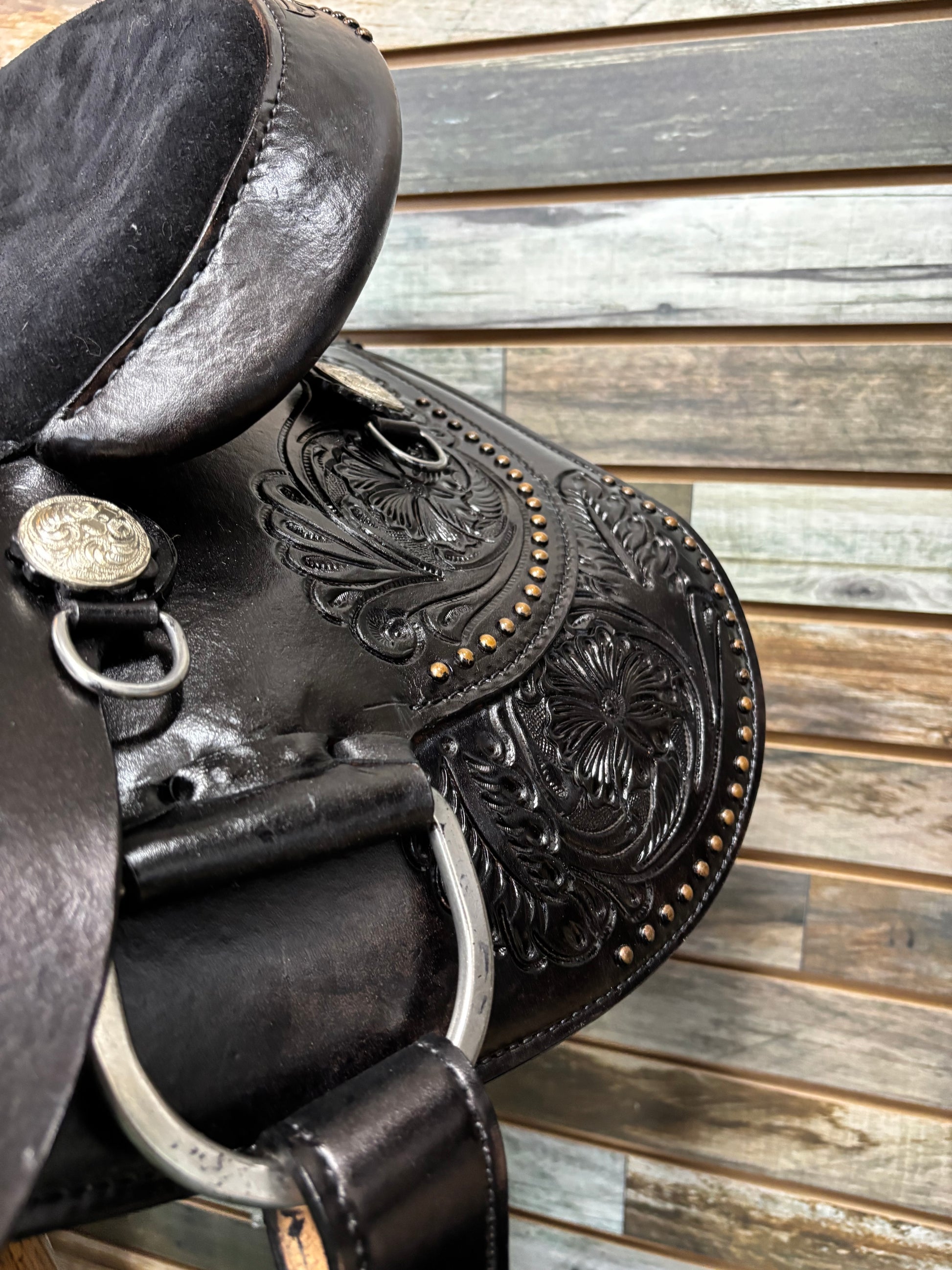✔ FEATURE: This horse's saddle features a gorgeous hand carved and tooled design in a Hand finished Black color. Proprietary designed and extremely robust tree. Black rough seat, 4.5-inch deep cantle. Leather covered Stirrups. Approx. 28 in Skirt Length and 38 lbs. weight, and 7 in Gullet.Full wide quarter horse bars.