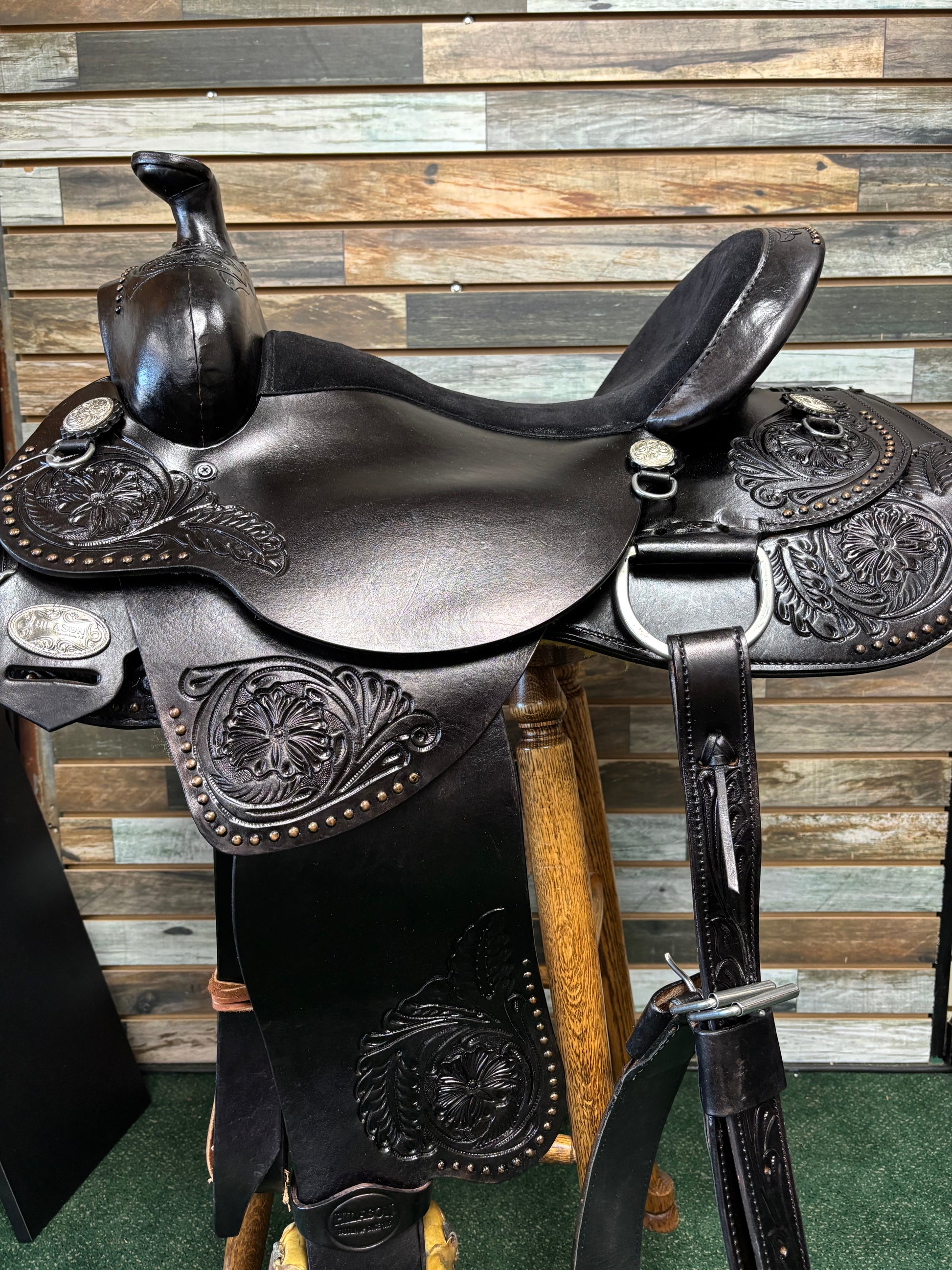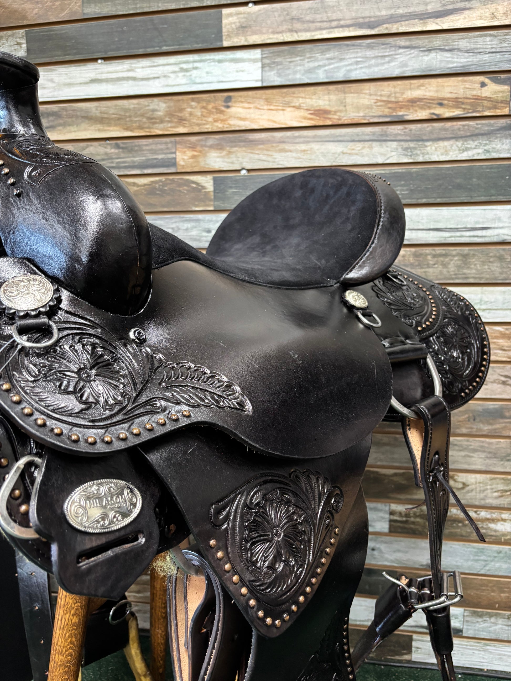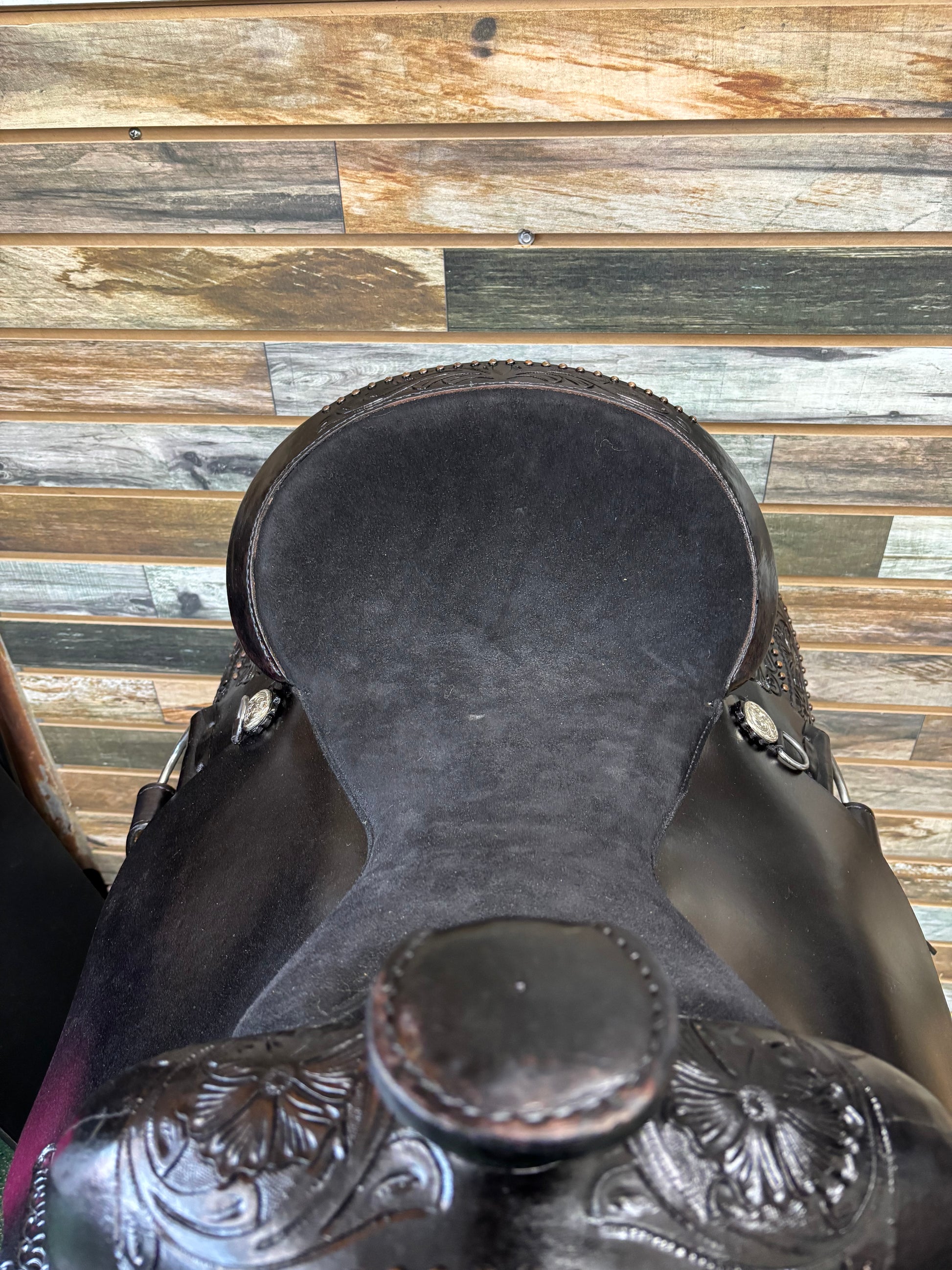 ✔ FEATURE: This horse's saddle features a gorgeous hand carved and tooled design in a Hand finished Black color. Proprietary designed and extremely robust tree. Black rough seat, 4.5-inch deep cantle. Leather covered Stirrups. Approx. 28 in Skirt Length and 38 lbs. weight, and 7 in Gullet.Full wide quarter horse bars.