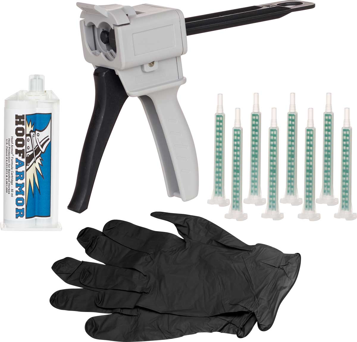 Hoof Armor hoof protection is an easily applied adhesive coating that farriers and horse owners alike can utilize to protect their barefoot horse’s hooves against abrasion and wear. Hoof Armor was designed to be used in a progressive conditioning program to enable a horse to comfortably and safely go barefoot. Use to help the sole grow thicker, enabling it to help the hoof wall support the horse’s weight and to provide protection from bruising. Starter Kit contains a 4:1 dispenser, a 50 ml cartridge of Hoof Armor, 8 turbo mix nozzles, two rubber gloves and detailed written instructions. (A 50 ml cartridge should coat 8 average size horse hooves.)
