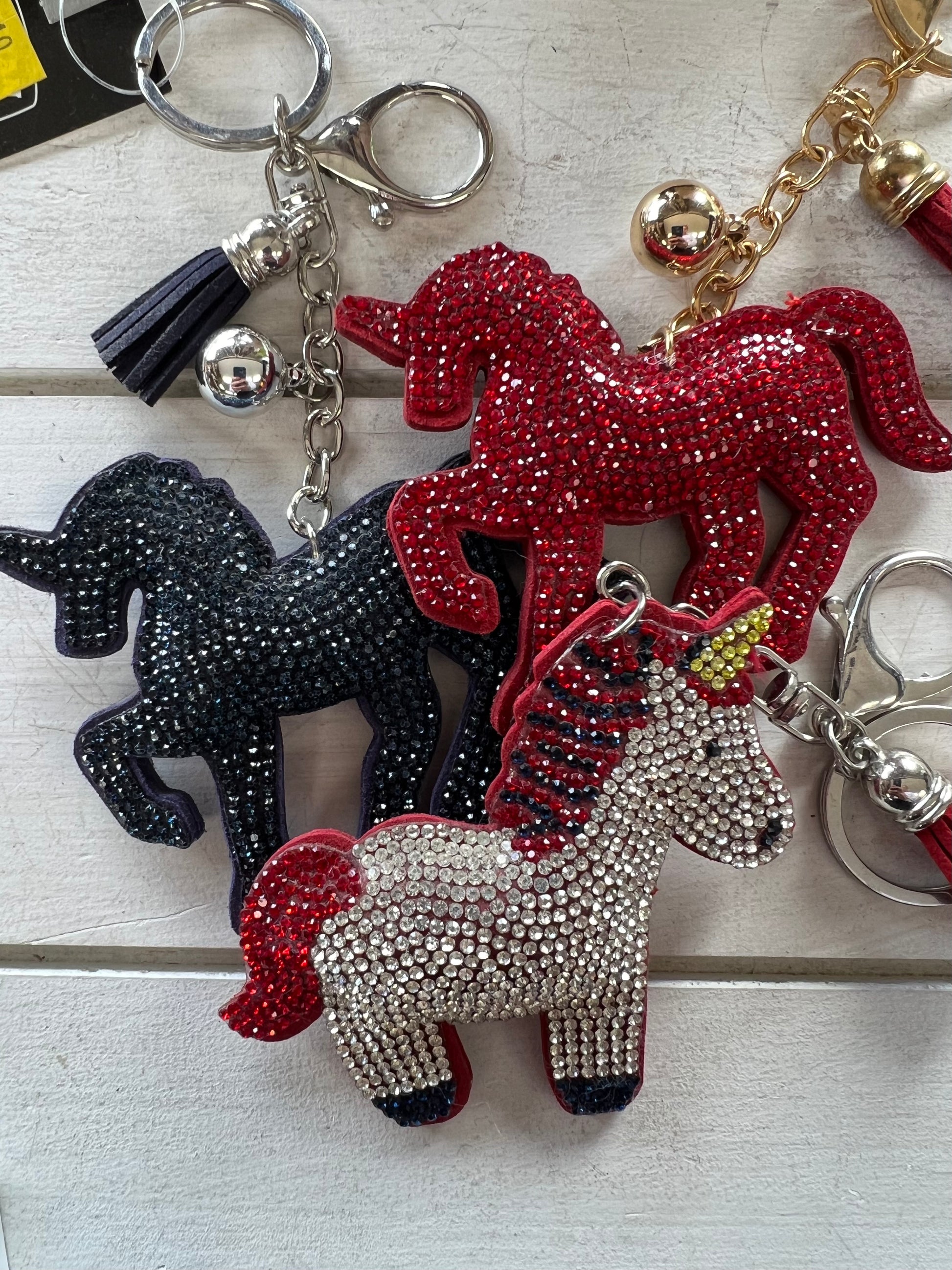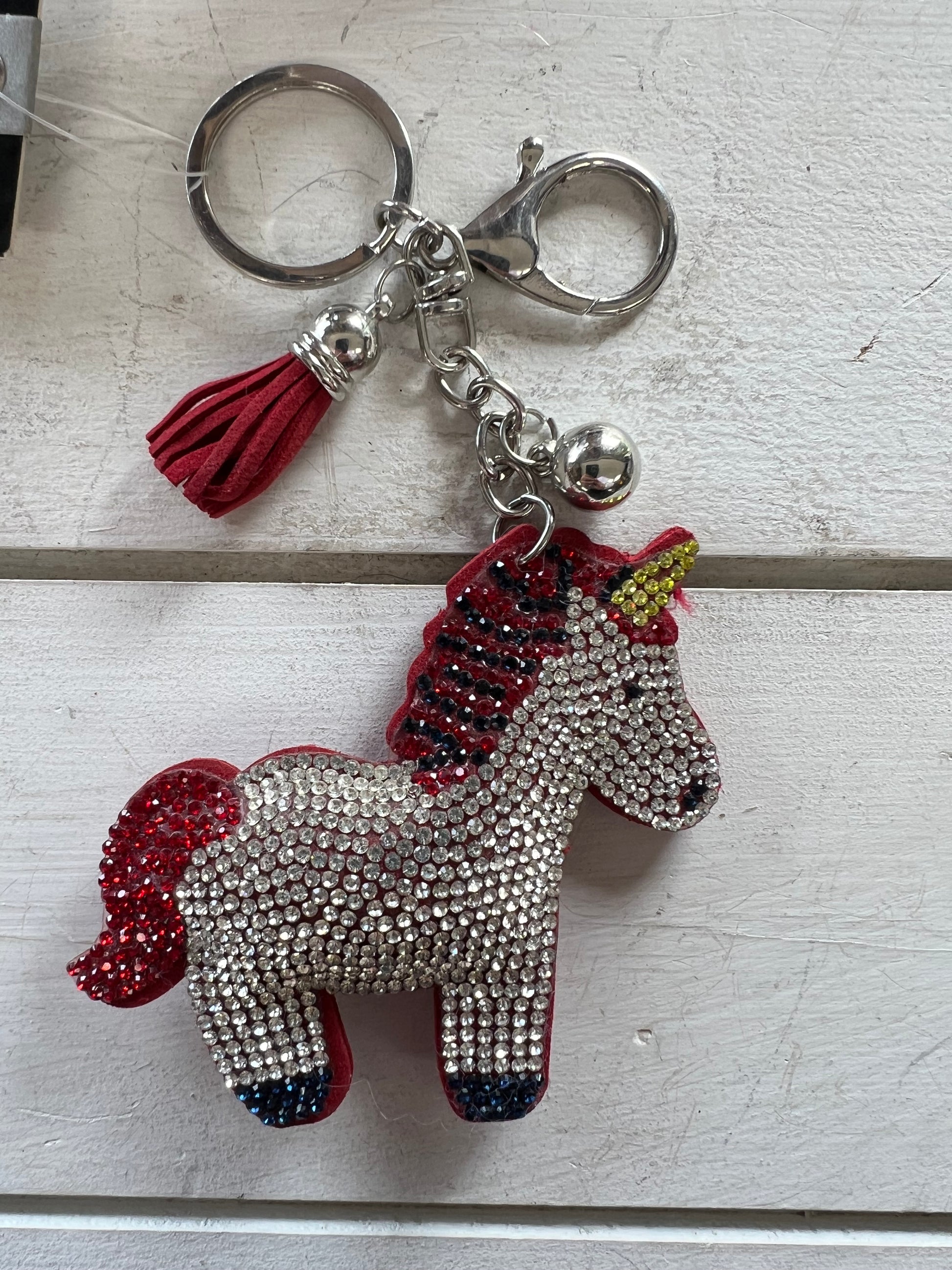 This magical Unicorn horse key chain is the perfect gift for your favorite horse buddy! Shiny and bright, it will bring sparkle to your handbag, bookbag, saddle bag, or use it as your favorite key chain. It features a faux leather stitched backing with the front encrusted in rich, sparkling crystals and has a generous size key ring to keep your keys secure as well as a trigger clip.It's adorned with a metal ball and a coordinating leather tassel