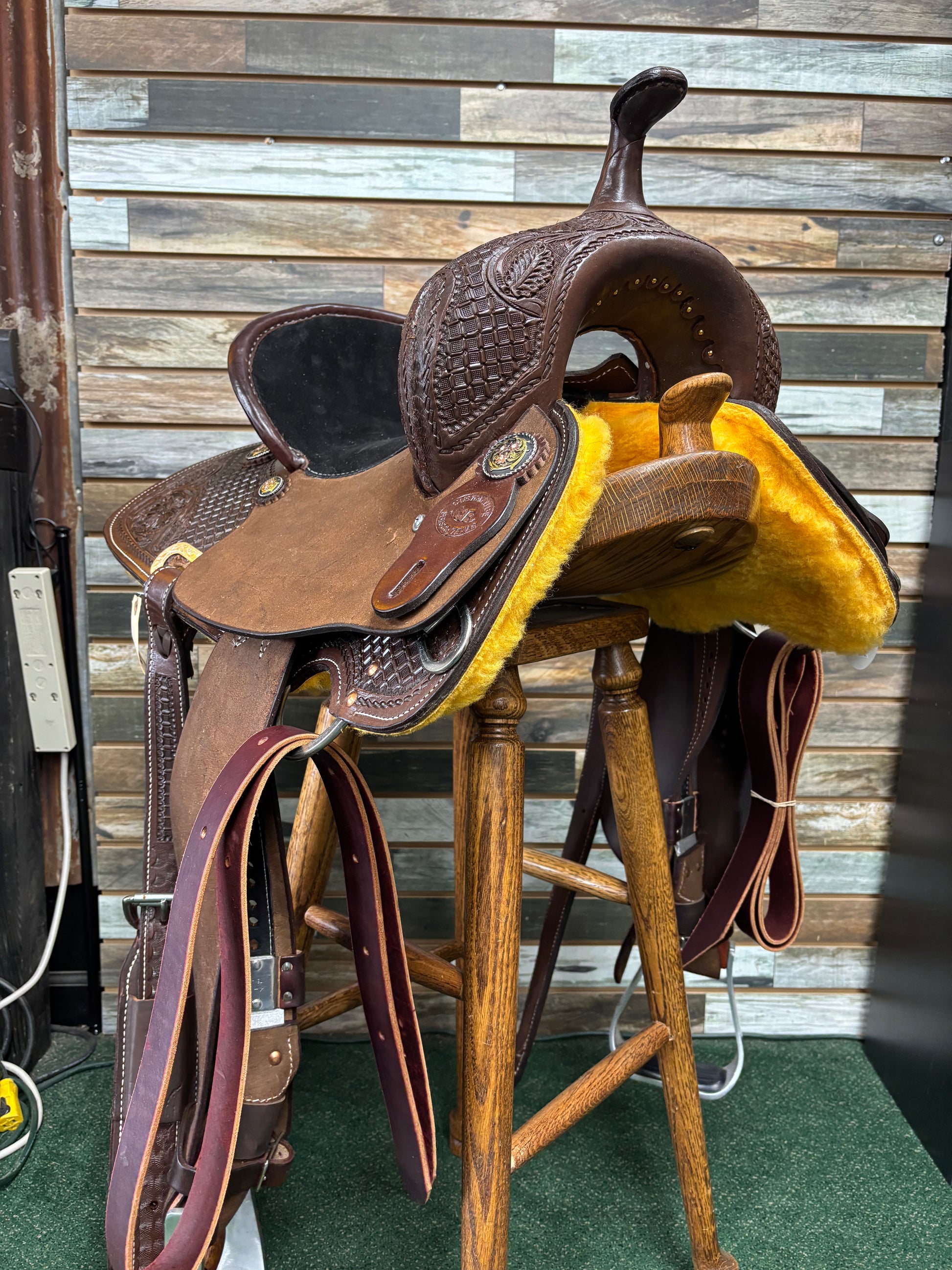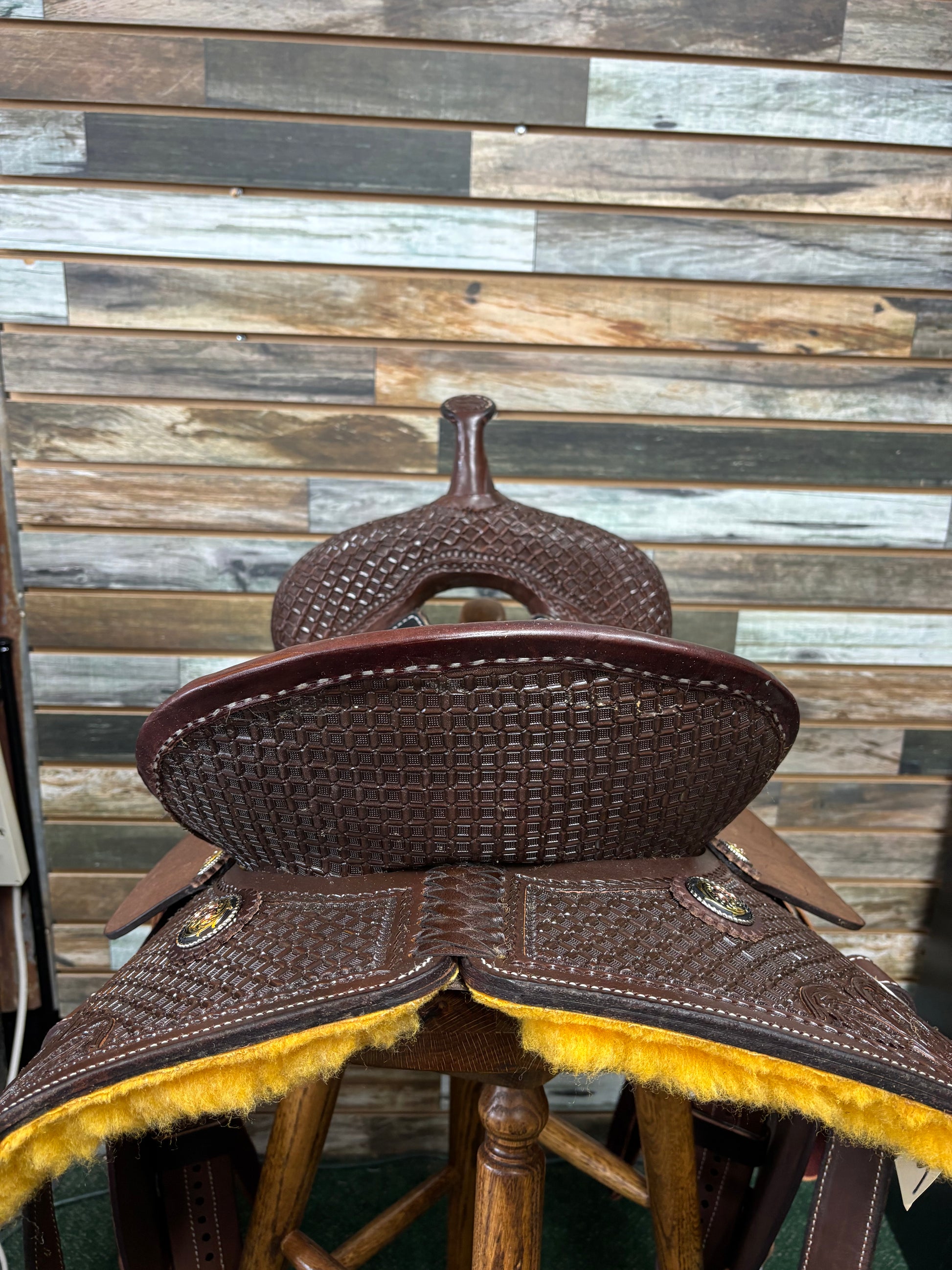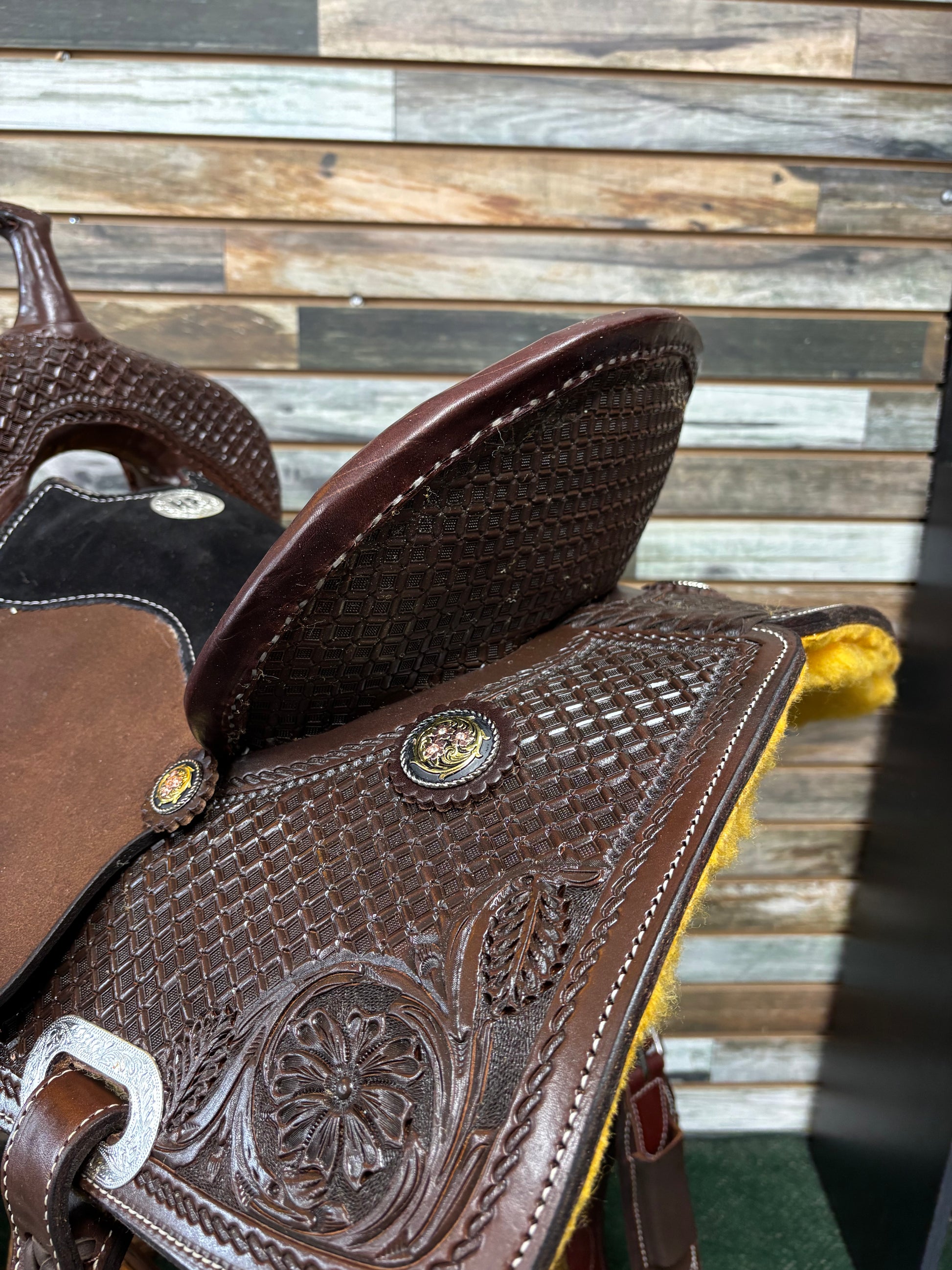 Featuring beautiful hand-tooled detailing in a rich chocolate finish, this saddle combines eye-catching craftsmanship with true functionality—perfect for competition or everyday riding.