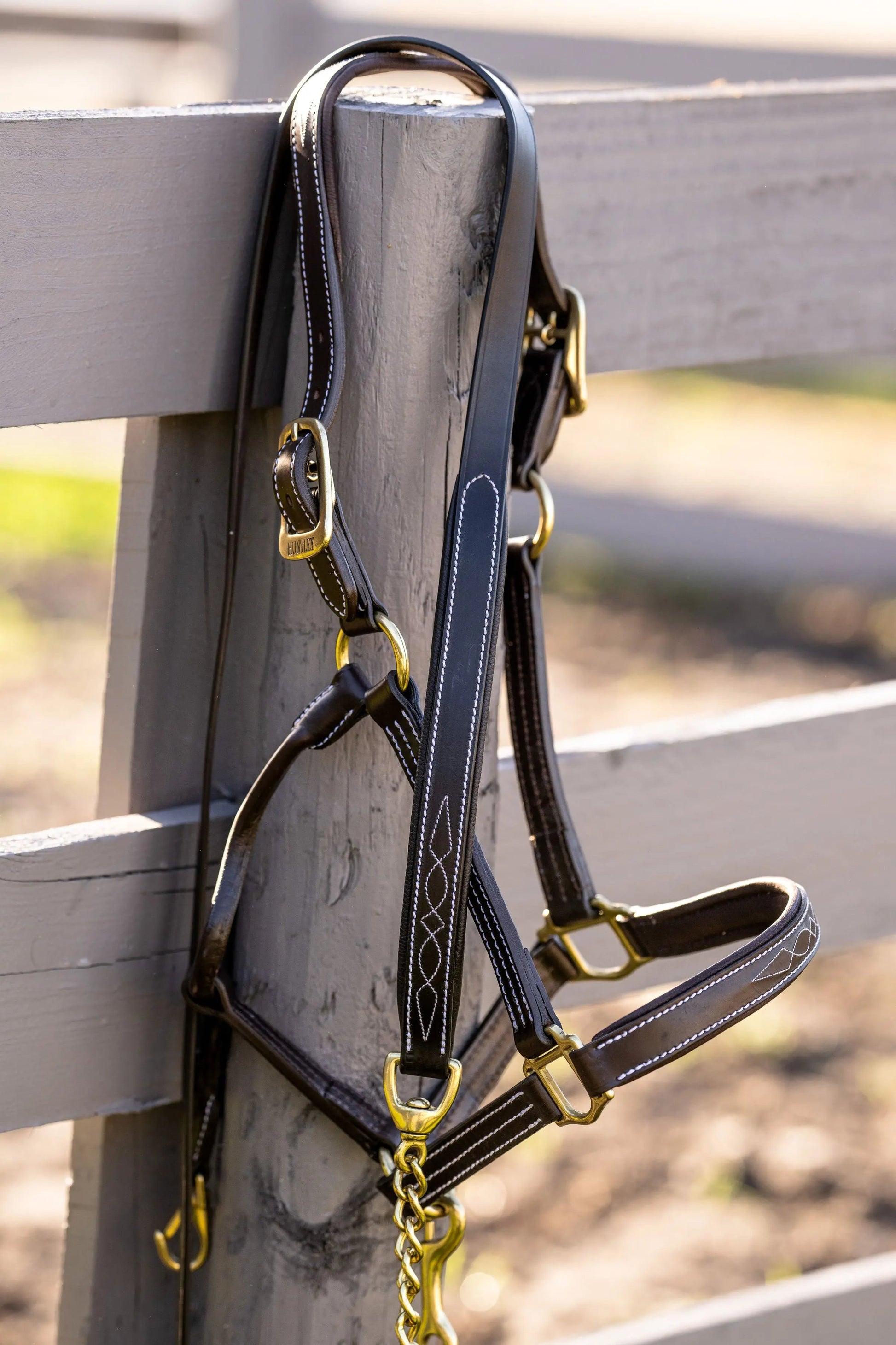 Huntley Equestrian Traditional Leather Lead and Fancy Stitched Padded Leather Lead with Brass chain are constructed with the finest Sedgwick English Leather, Havana color. The Huntley leather lead includes high quality, durable 1" Inch wide leather that measures 6 Feet long, 12" inches of padding lining starting from the hardware sewn underside of the leather, and 25" inches of brass chain and snap. This leather lead is classically and beautifully constructed with white fancy stitching, soft padding for comfort leading and handling, hand-rubbed edges, brass hardware, finished with a tapered end design. This versatile leather lead is great for everyday use at the barn or traveling to shows. This Huntley leather lead will compliment any halter for any size horse or pony. Available in Havana color.