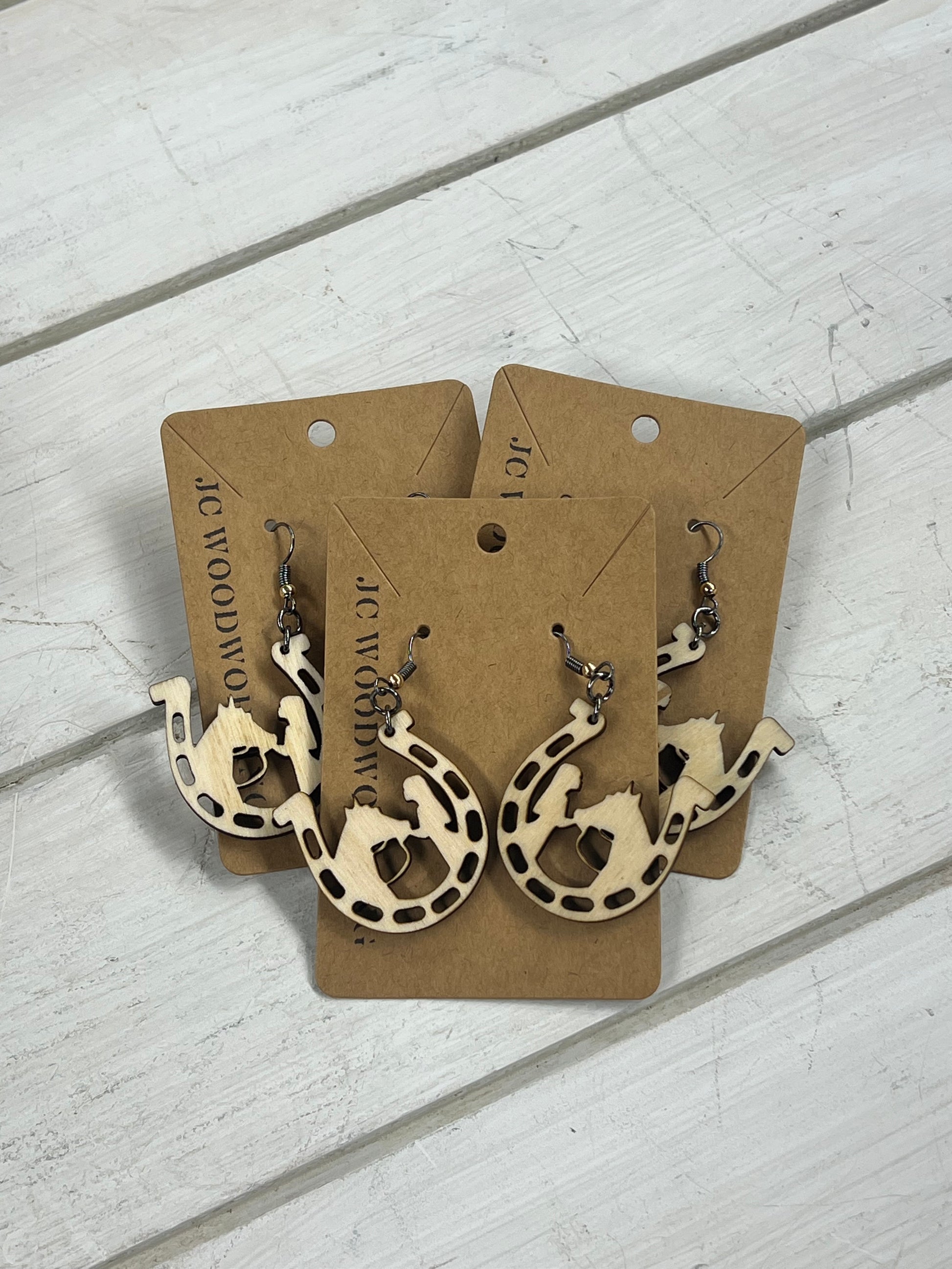 JC Woodworking Horseshoe with Horse & Rider Dangle Earring