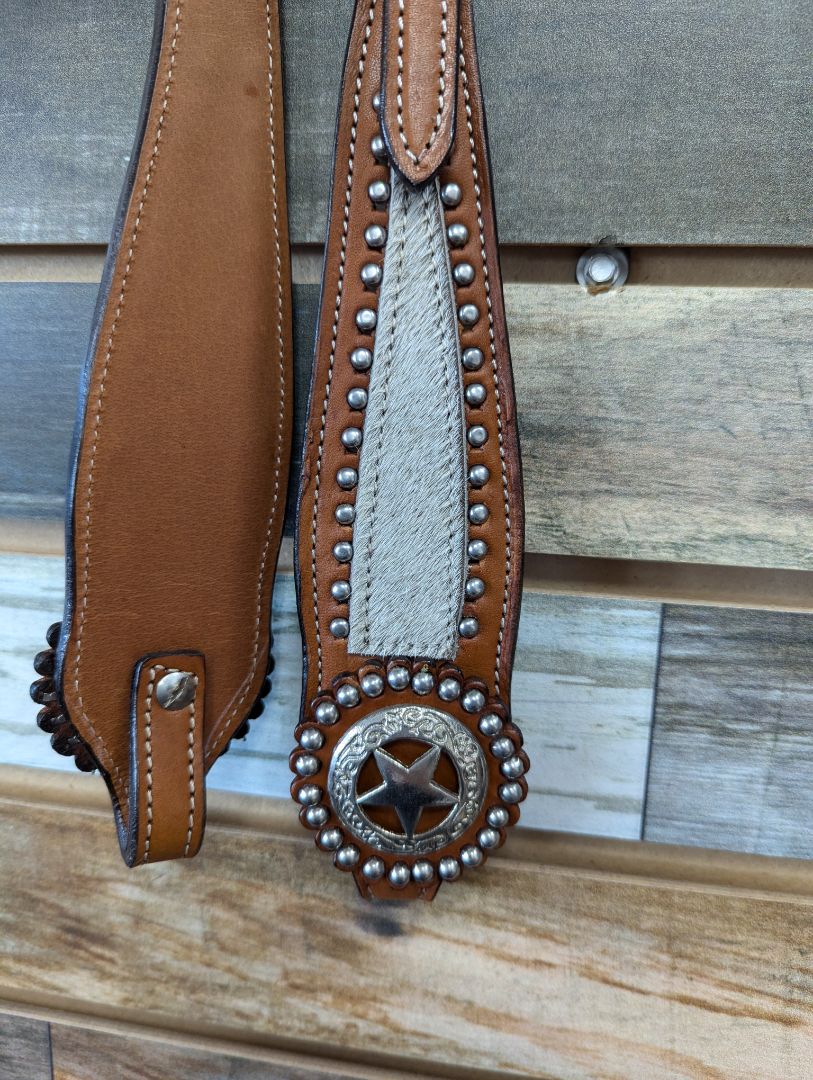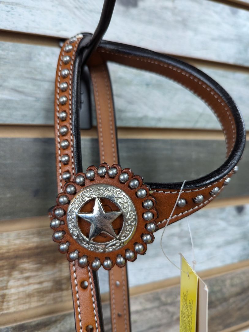 New JTI single ear with silver studs and silver conchos. Along the cheek piece is a horse hair decoration.