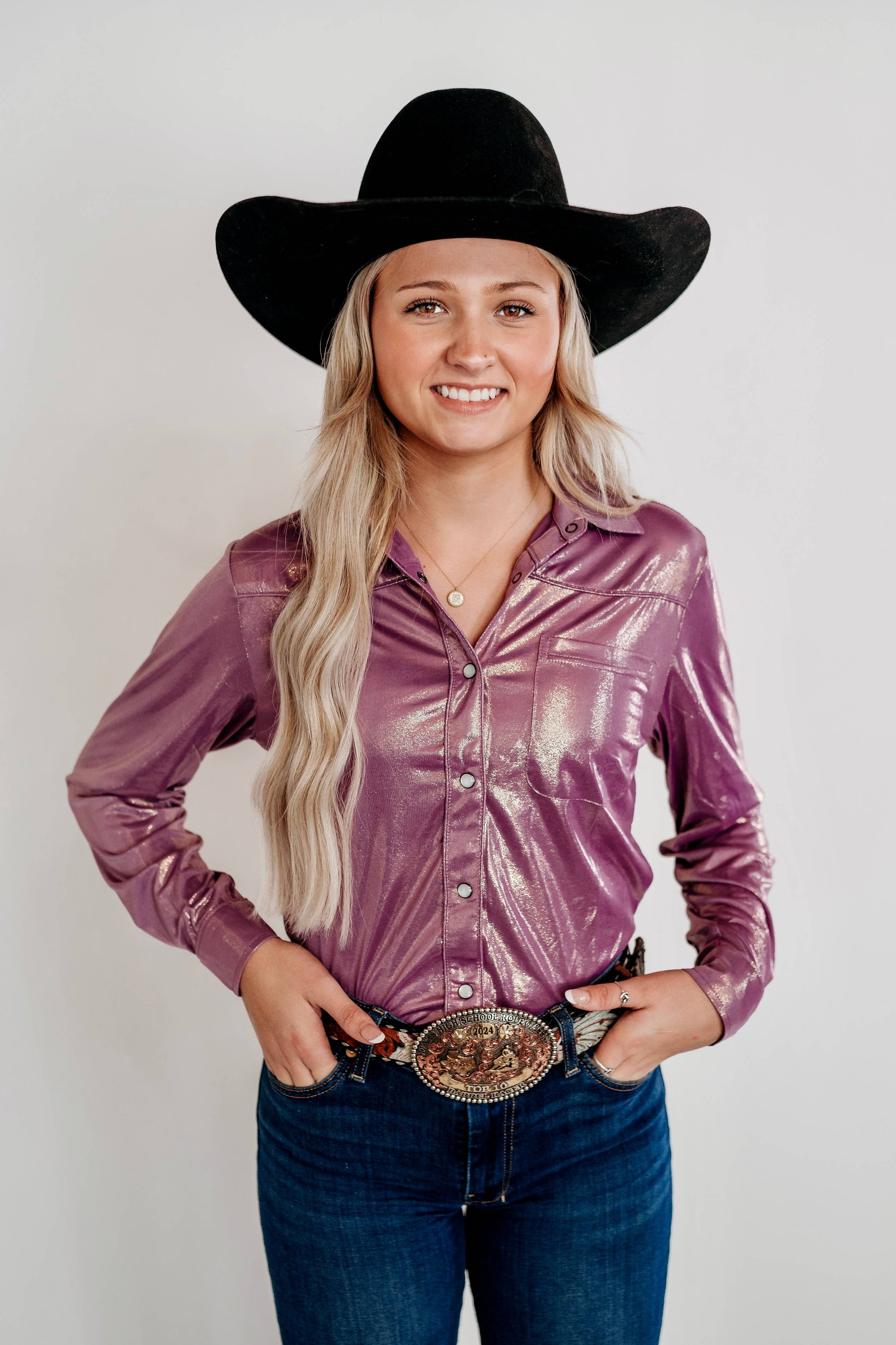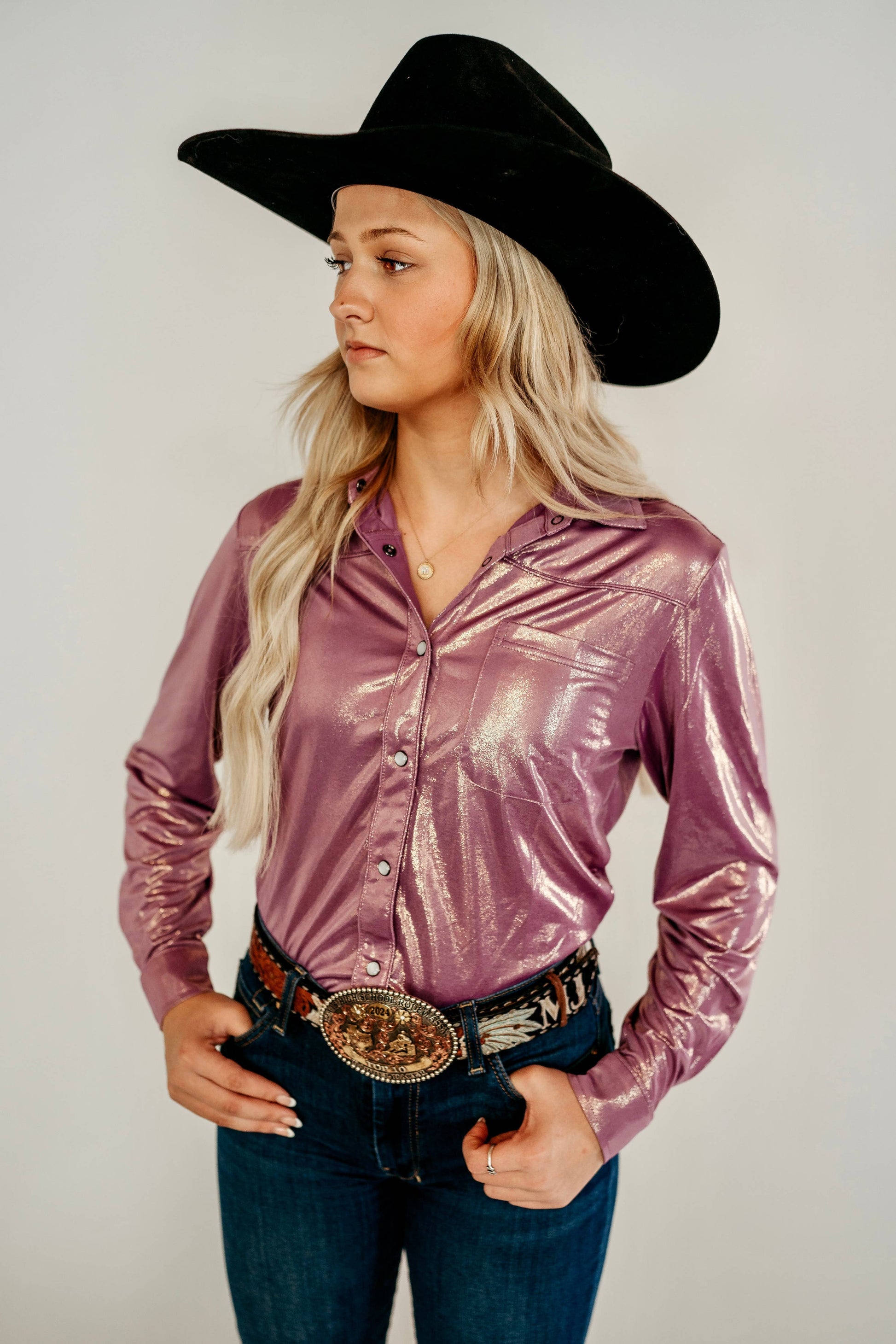 Introducing the Lilac Pearl Snap - the perfect addition to your wardrobe. Made with a metallic fabric, this light weight and thin Pearl Snap is ideal for both casual and formal occasions.
