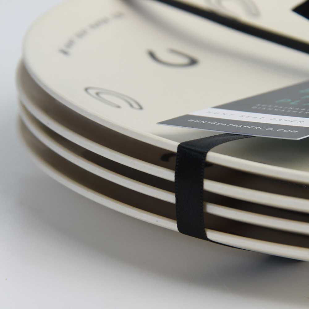 Each set includes four 10" plates, bundled with a satin ribbon.