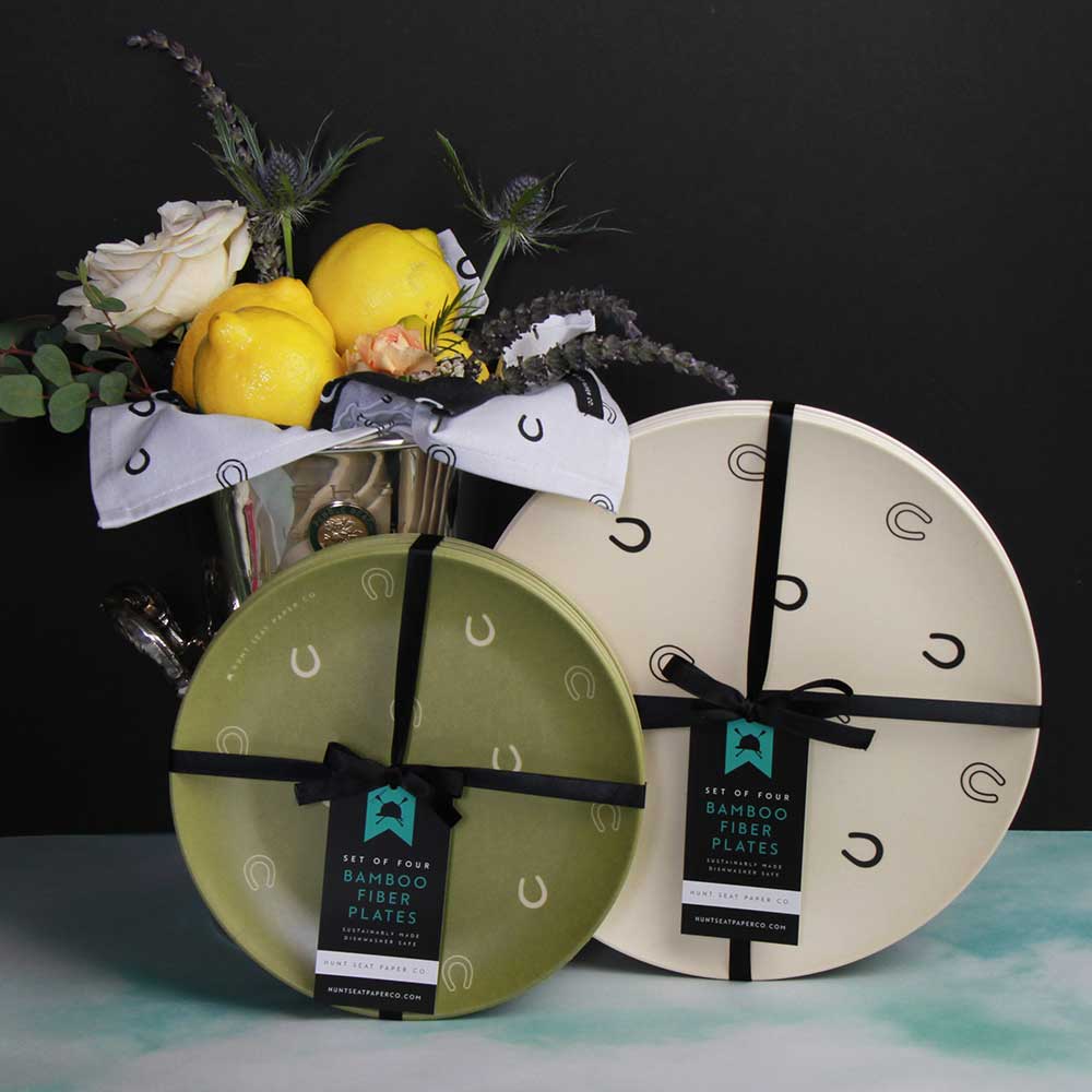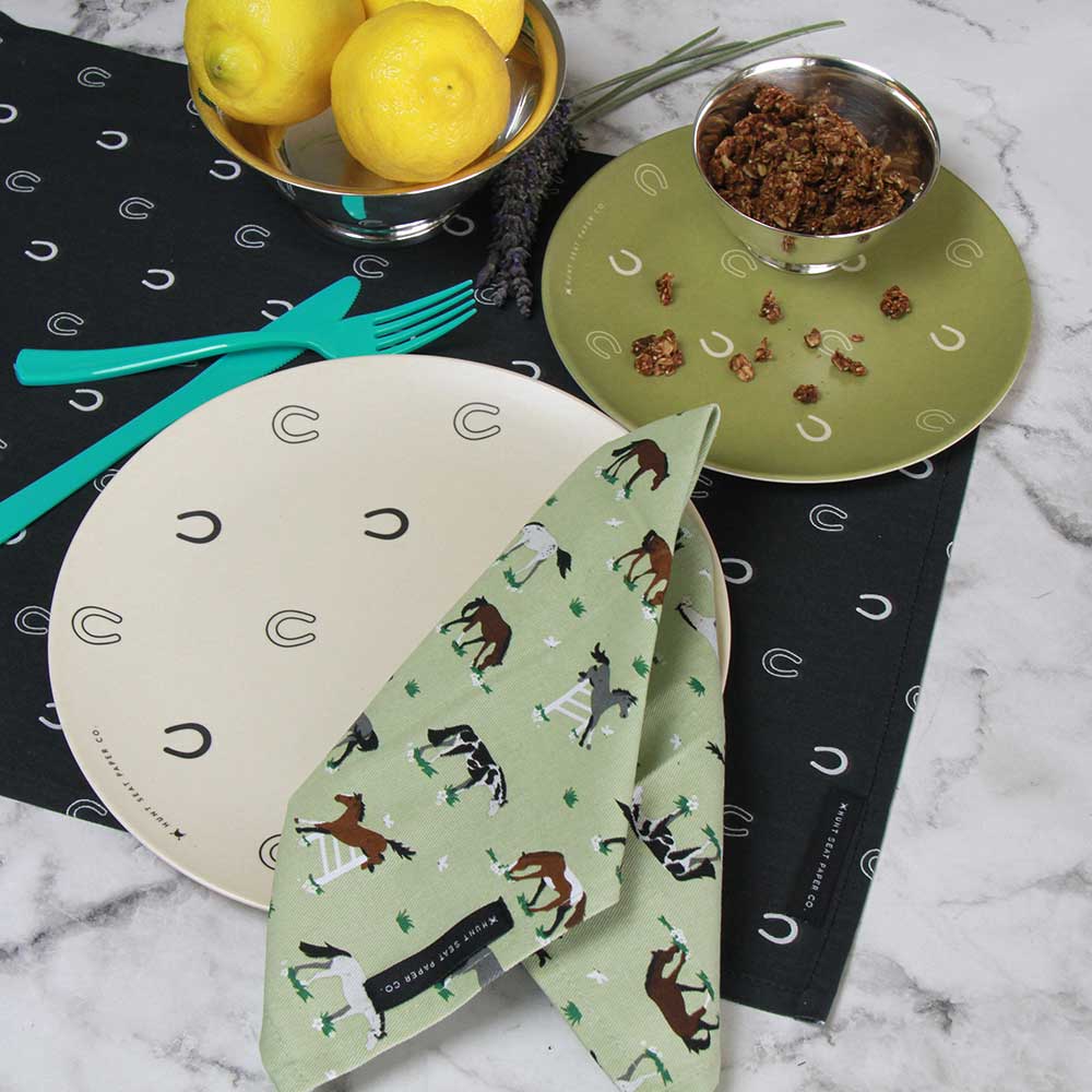 Barn parties, picnics, motorhomes, horse show tents, and kids! These eco-friendly bamboo dinner plates are made to party, and perfect for lunch on the lawn at the Grand Prix. Bring a little equestrian chic to your next table setting and coordinate our plates with mix + match placemats and napkins too!