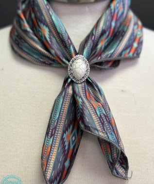 Cover up in style with this Mini By Your Grace Wildrag! This cream-colored wild rag is sure to be the showstopper of any ensemble, featuring a fun turquoise, orange, teal and red aztec design. Two snaps keep this wild rag securely around your neck, and the stylish look is sure to make you the envy of all your friends!