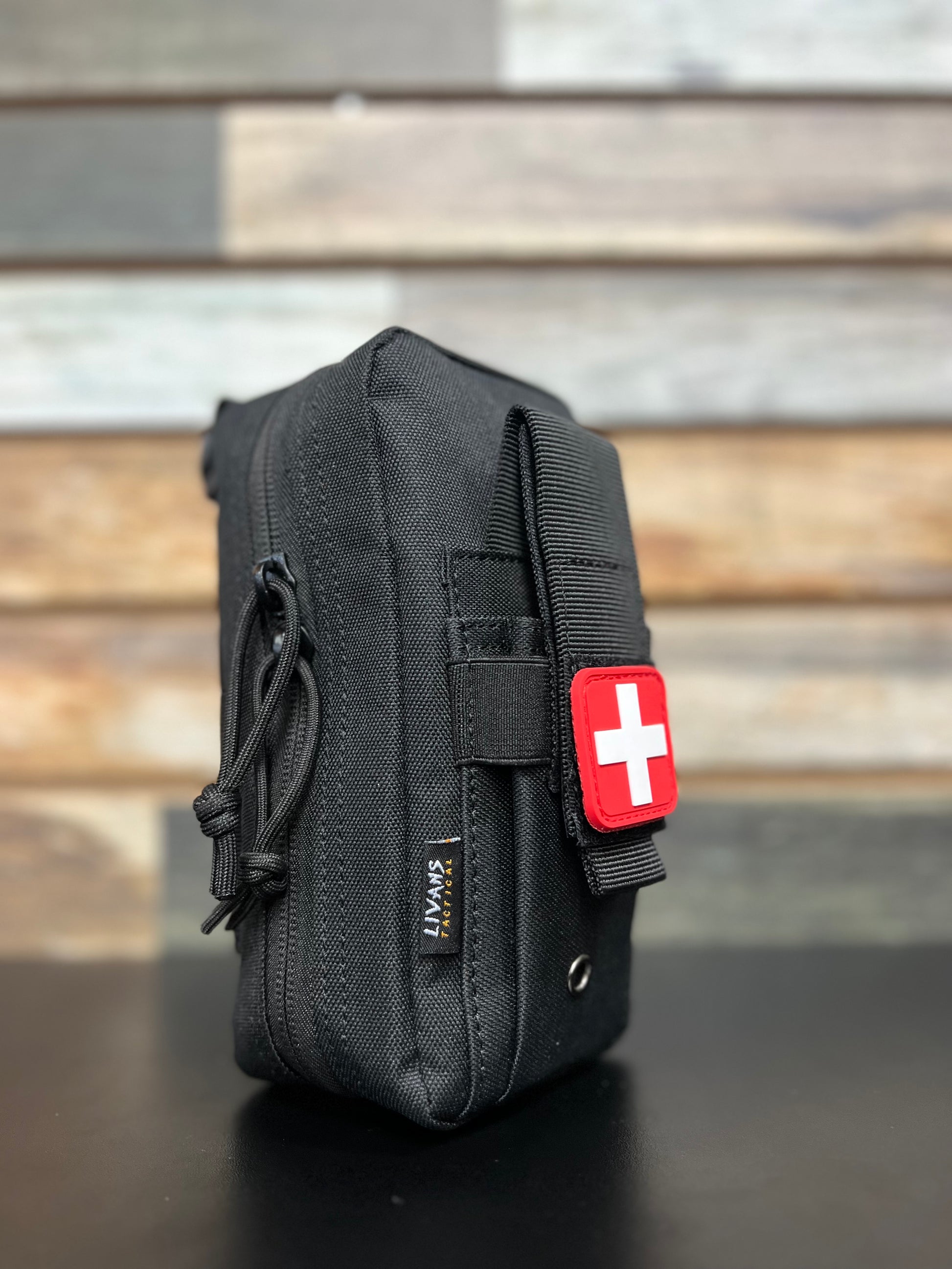 Kit comes in a 7.5" x 4" x 3.5 black nylon back with Molle attachment system. Included two quick release connectors on the back.