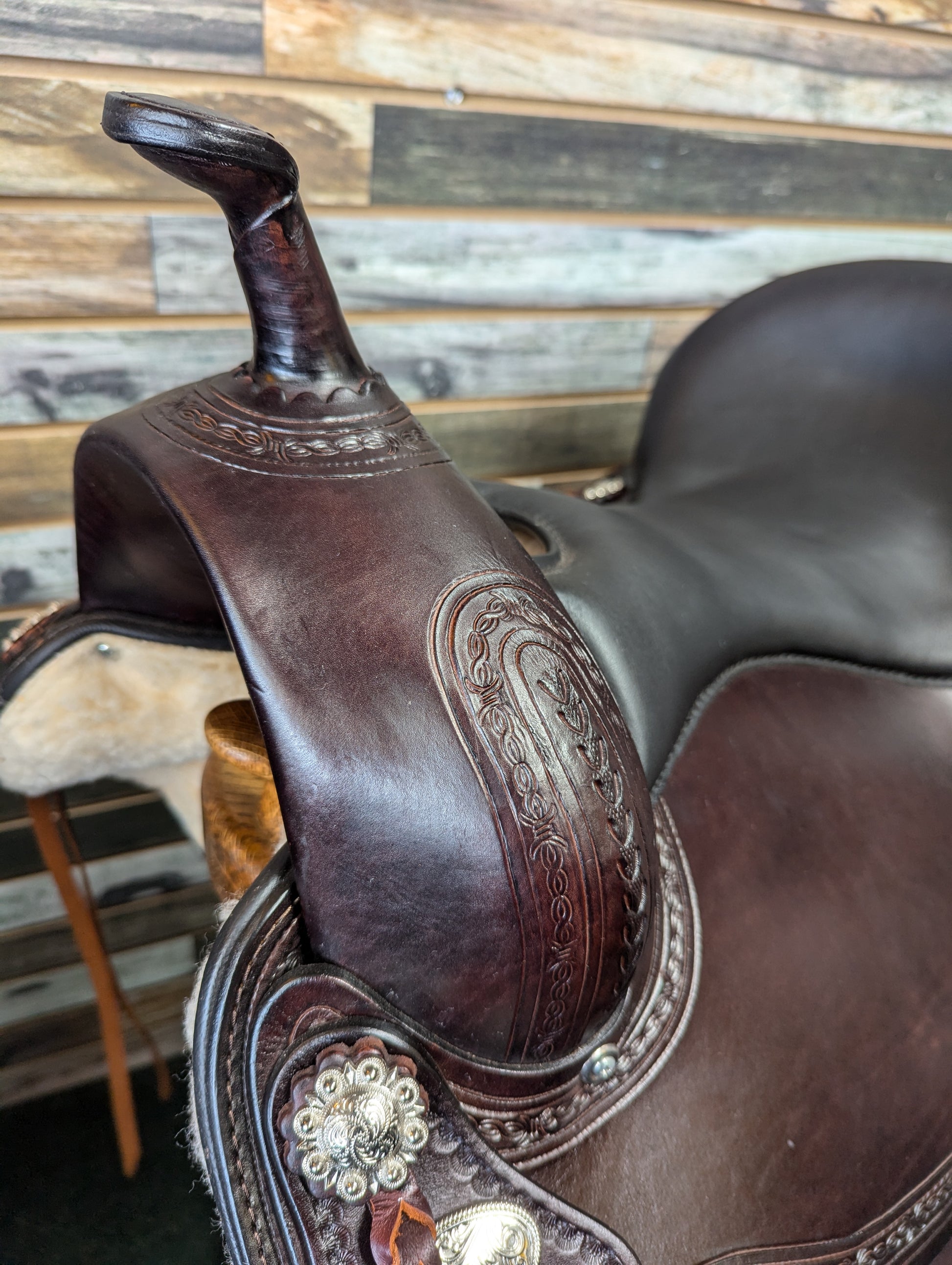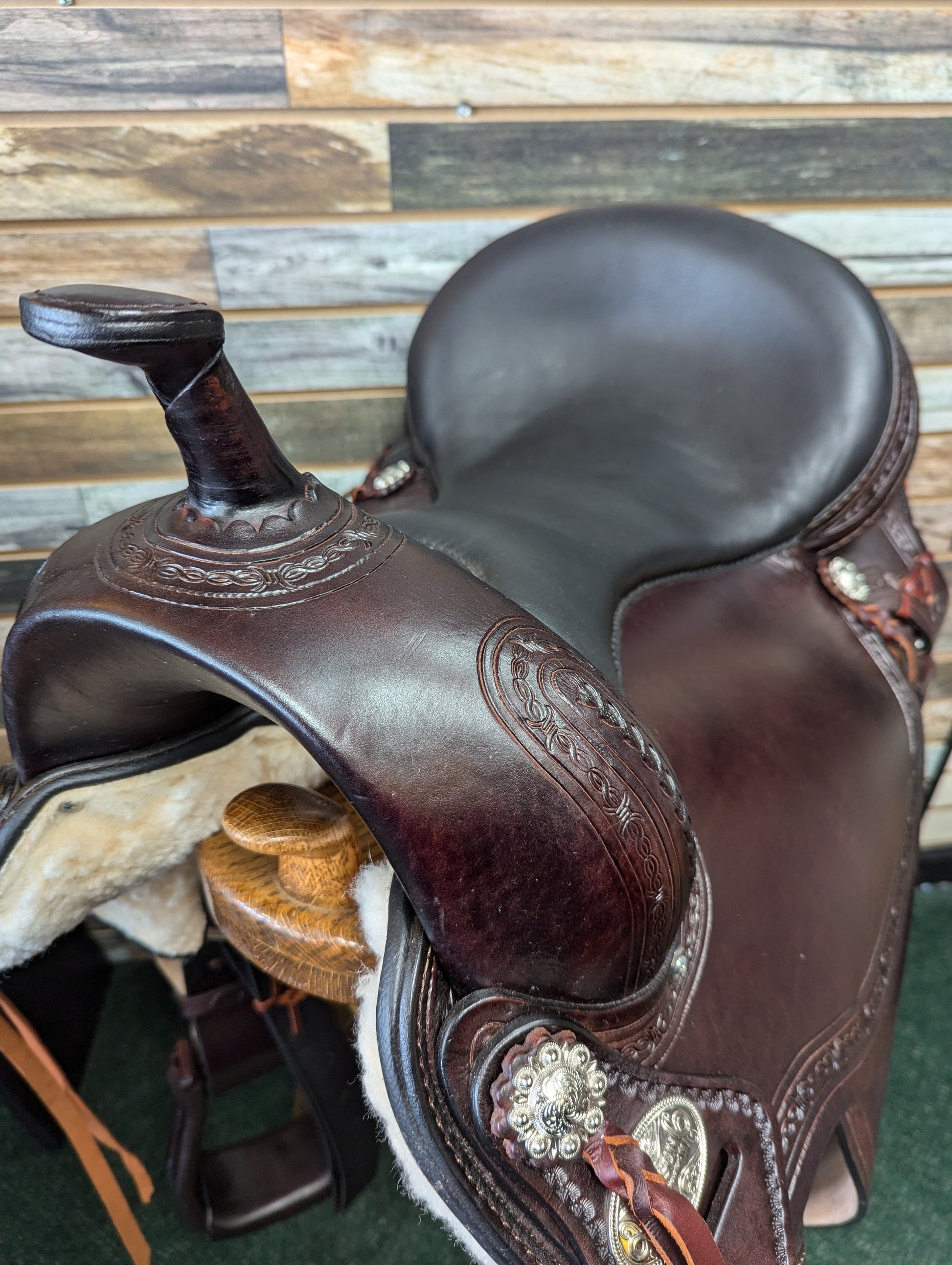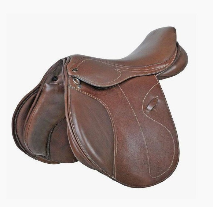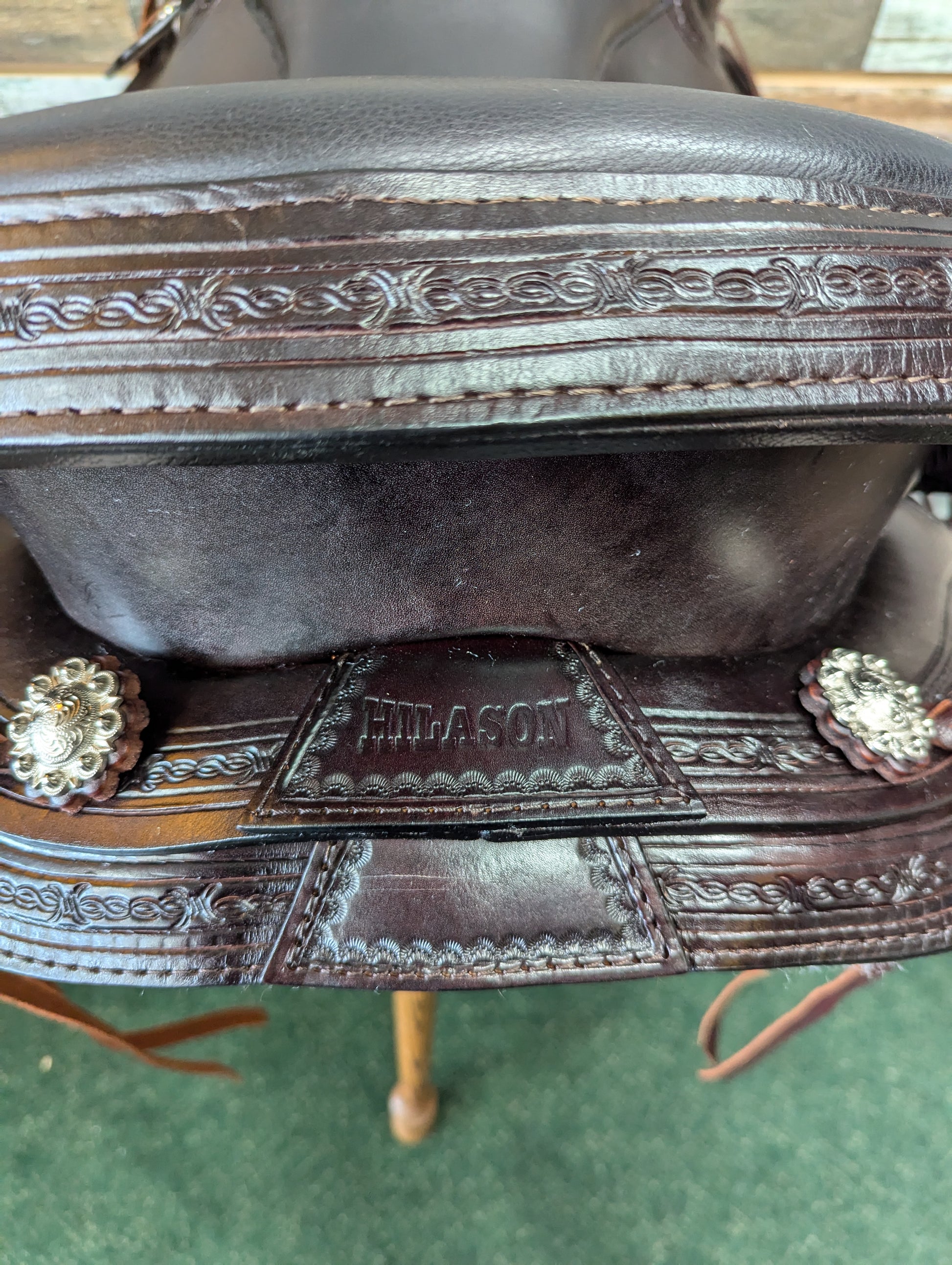 The Hilason saddle is made with genuine premium quality American cowhide skirting leather. The saddle features dark brown colored leather, black smooth leather Seat, 5" cantle, 28 lbs. weight, and fit 6" to 8" gullet.