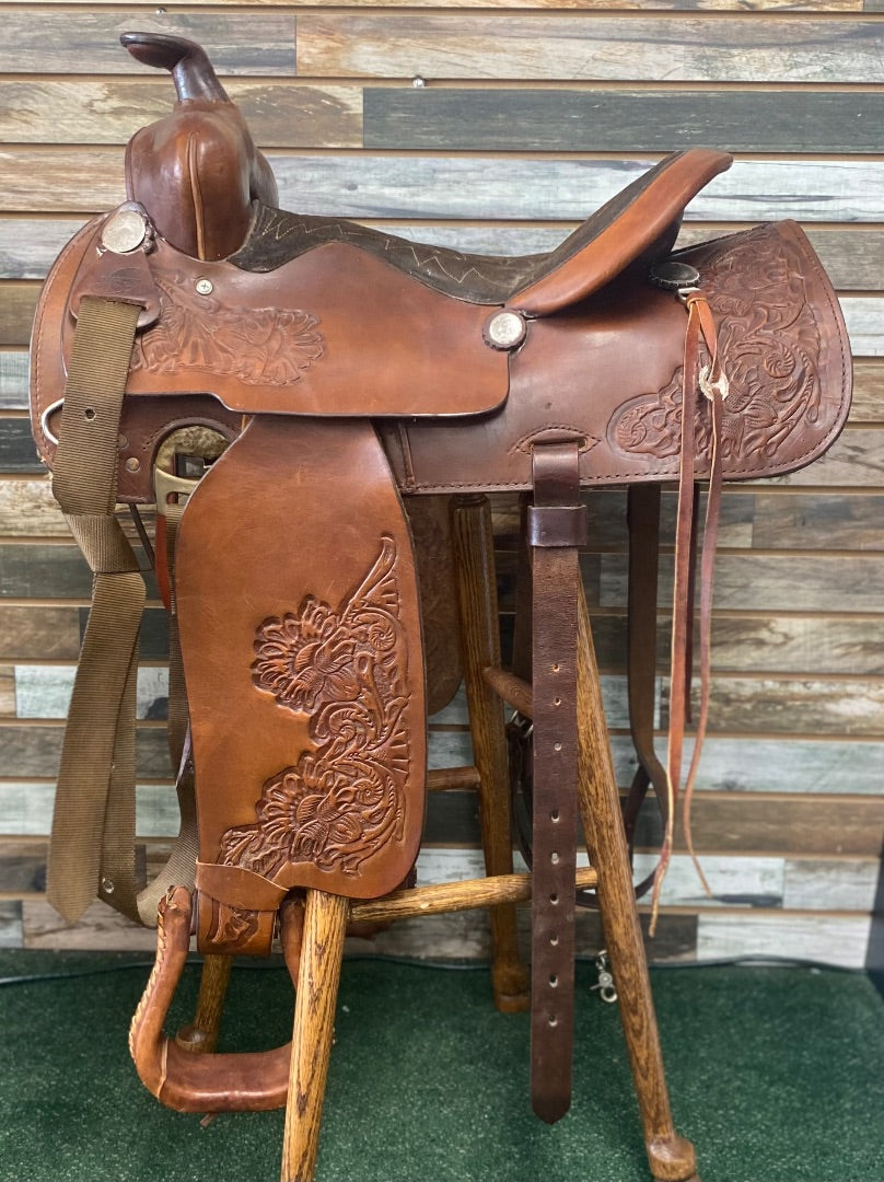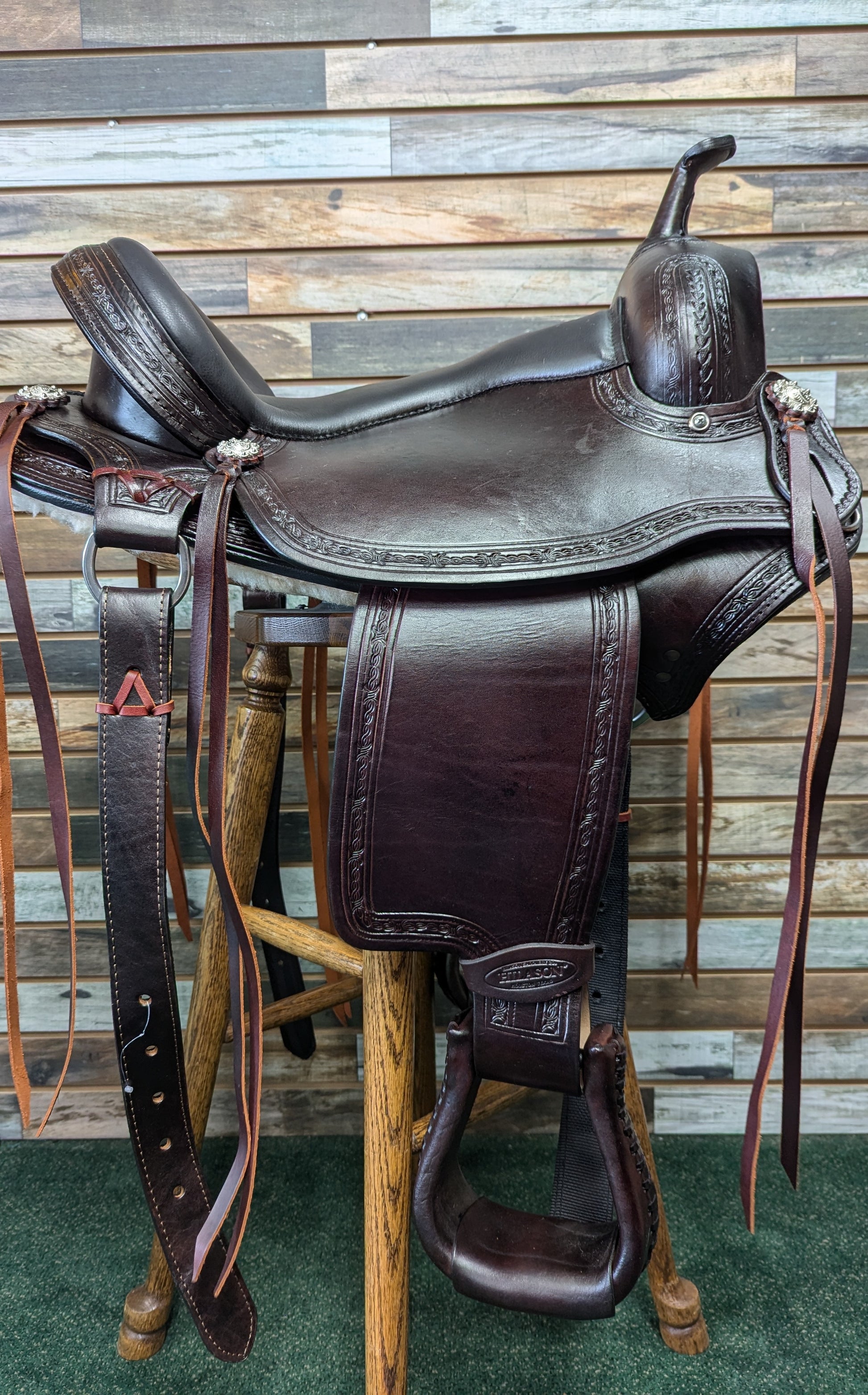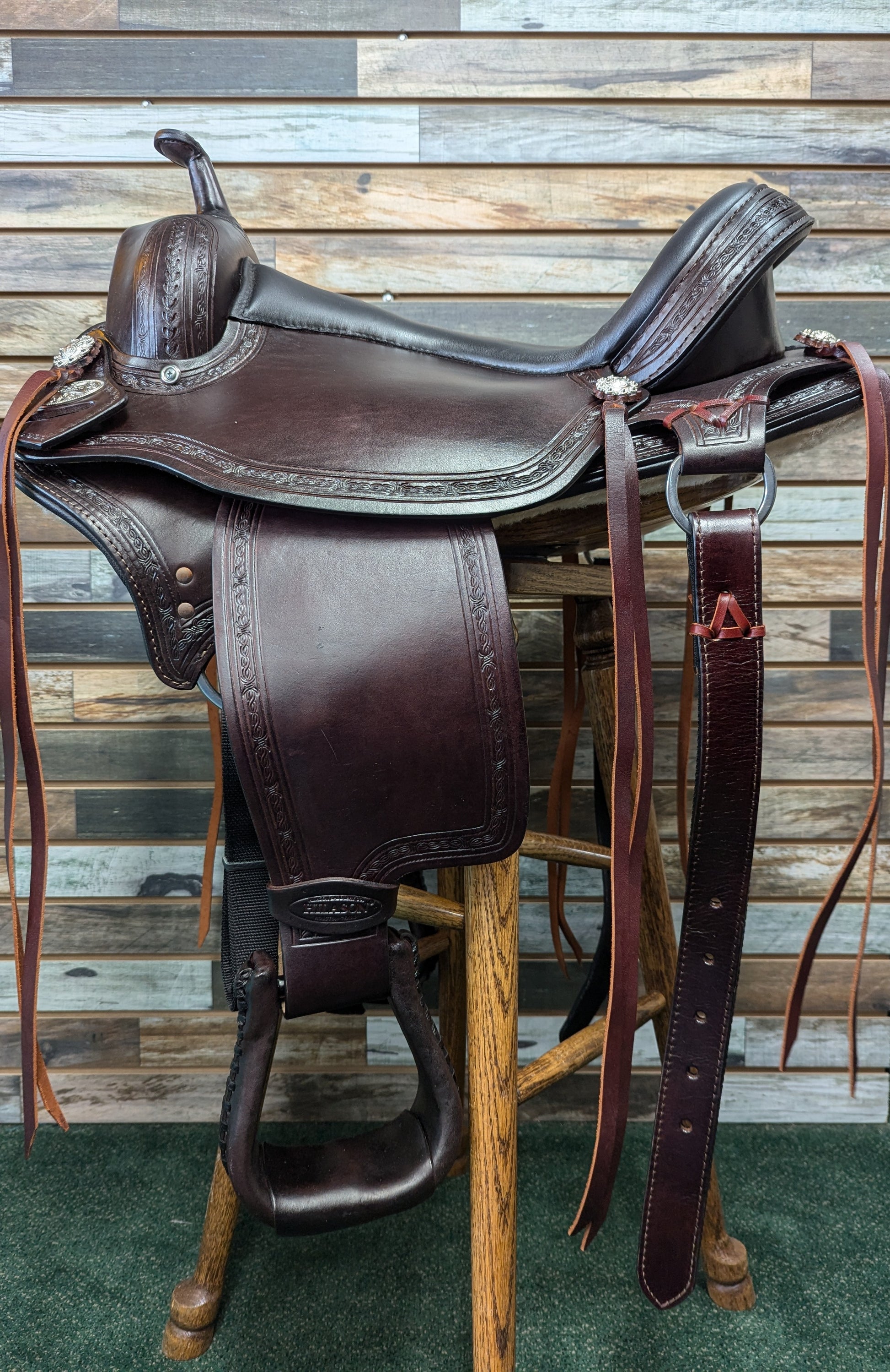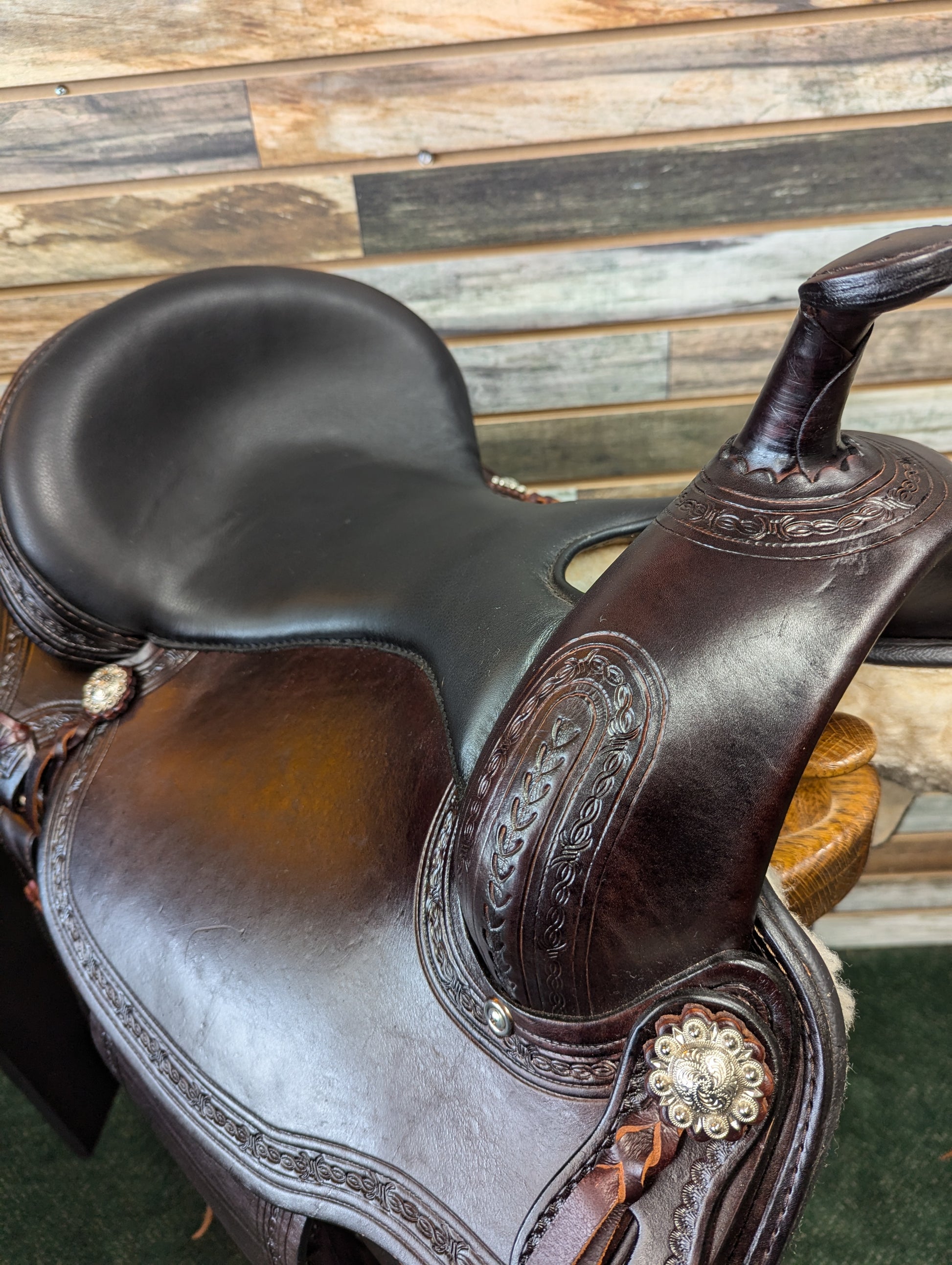The Hilason saddle is made with genuine premium quality American cowhide skirting leather. The saddle features dark brown colored leather, black smooth leather Seat, 5" cantle, 28 lbs. weight, and fit 6" to 8" gullet.