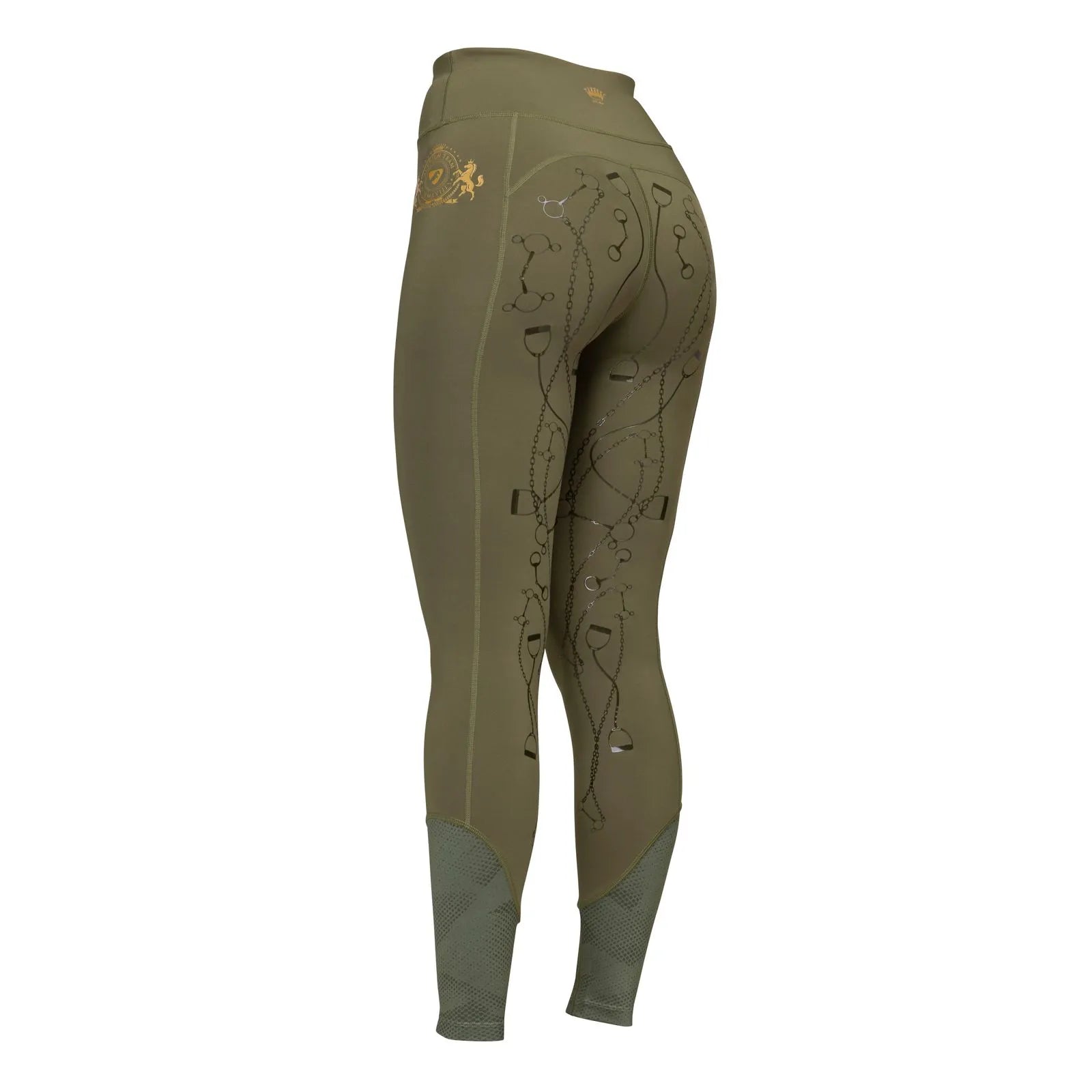 These pull on tights are high rise, with a wide waistband. They are made of a tech stretch fabric that is supportive and wicks away moisture. The comfort seams assure no chafing, and the silicon seat and leg grips give you the perfect amount of "stick" in the saddle. There is a thigh phone pocket.