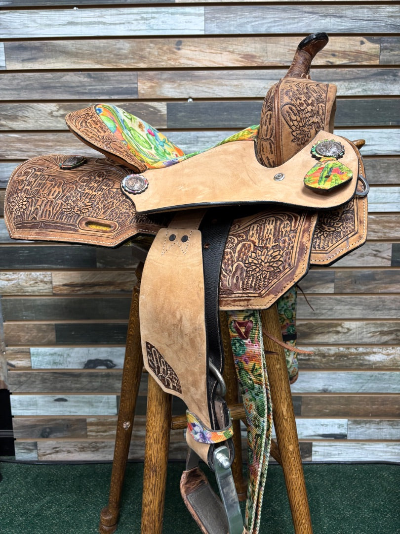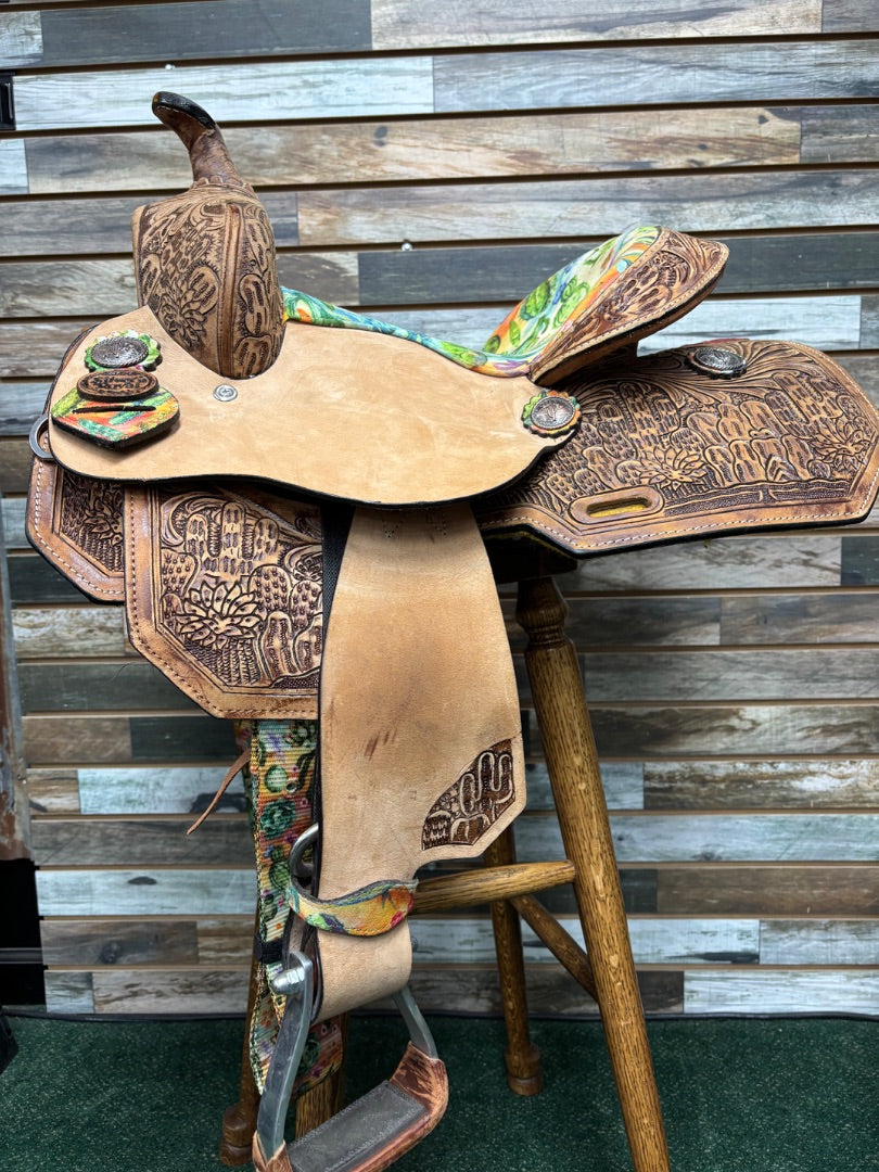 Cactus lovers look no further! This stunning saddle is built on a sturdy rawhide wrapped fiberglass tree with quarter horse style bars for a secure and balanced ride. The deep seat and roughout jockeys and fenders offer superior grip for the rider’s seat during fast turns and quick stops. Hand carved one-of-a-kind cactus themed tooling designs cover the skirt while the seat features a fun and colorful cactus print. Complete with aluminum barrel stirrups with non-slip tread, covered in-skirt rigging, matching cactus print tie strap/off billet, and Tough1 Quick Change stirrup buckles.