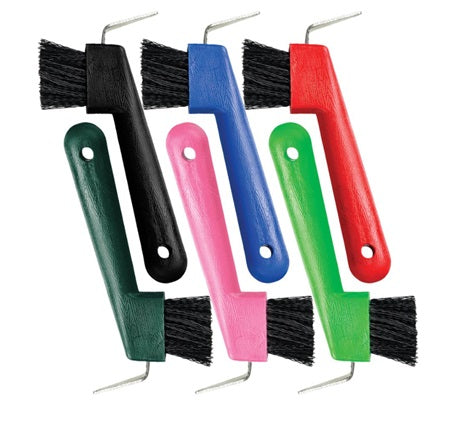 Made of durable polymar this hoof pick features super stiff nylon bristles for brushing away loose dirt and a durable tempered steel pick for removing packed dirt from hooves.