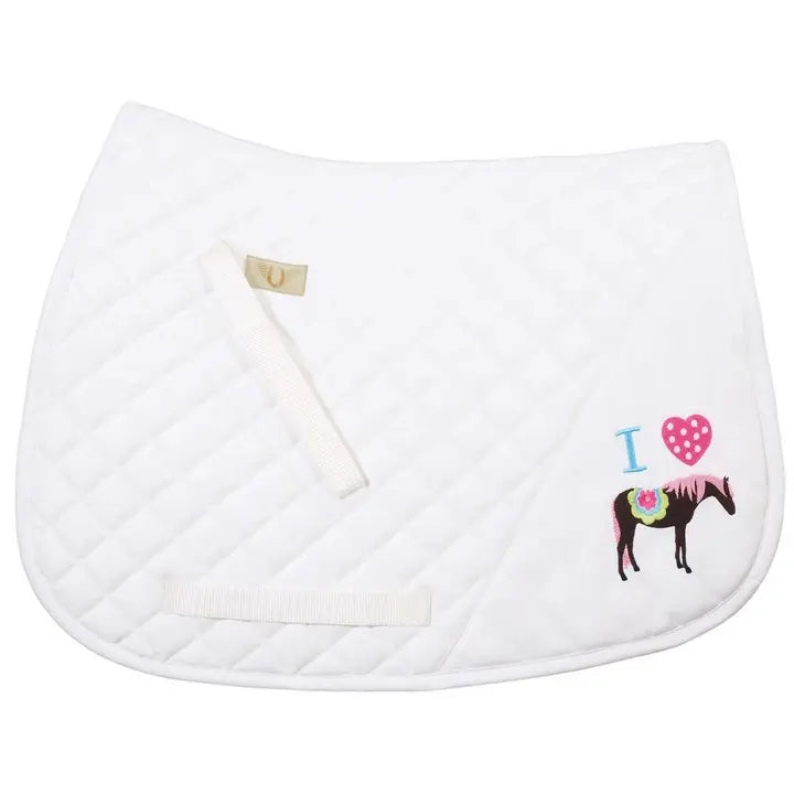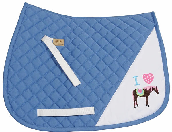 This super cute TuffRider I Heart Pony Girl Saddle Pad comes in an adorable pony design that will be a favorite for young riders. The diamond quilted all around saddle pad is available in hot pink, white, or Parisian blue.