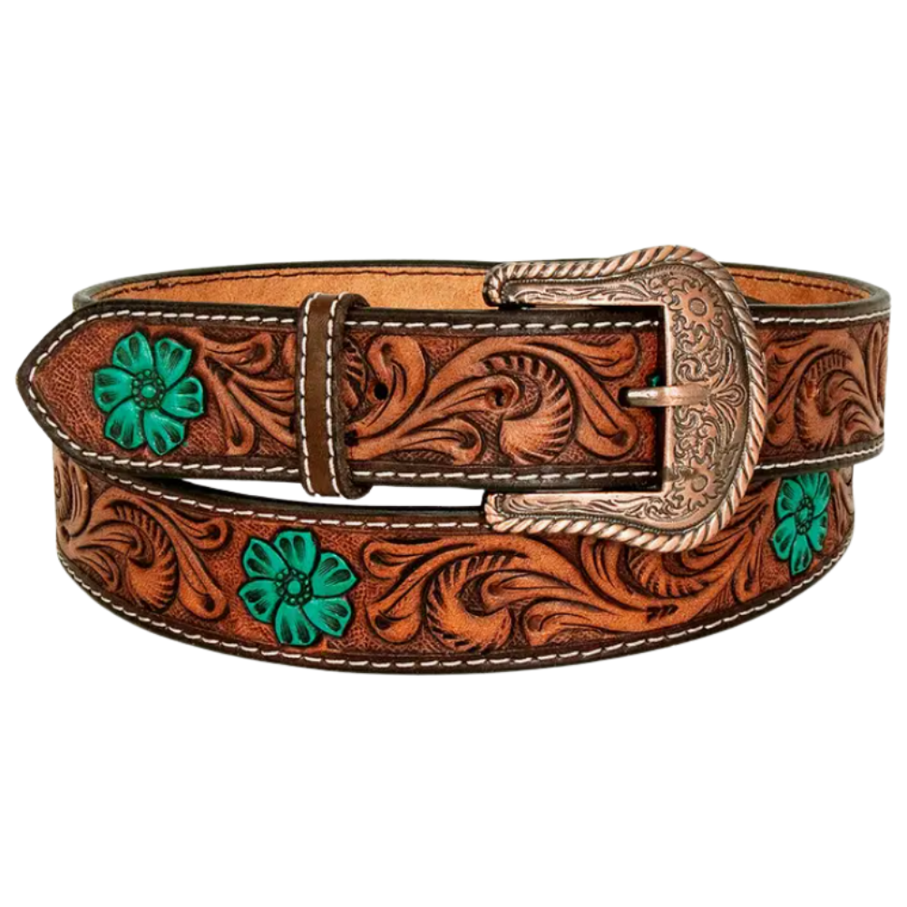 Turquoise Flower Hand Painted Cowhide Leather Adult Belt
