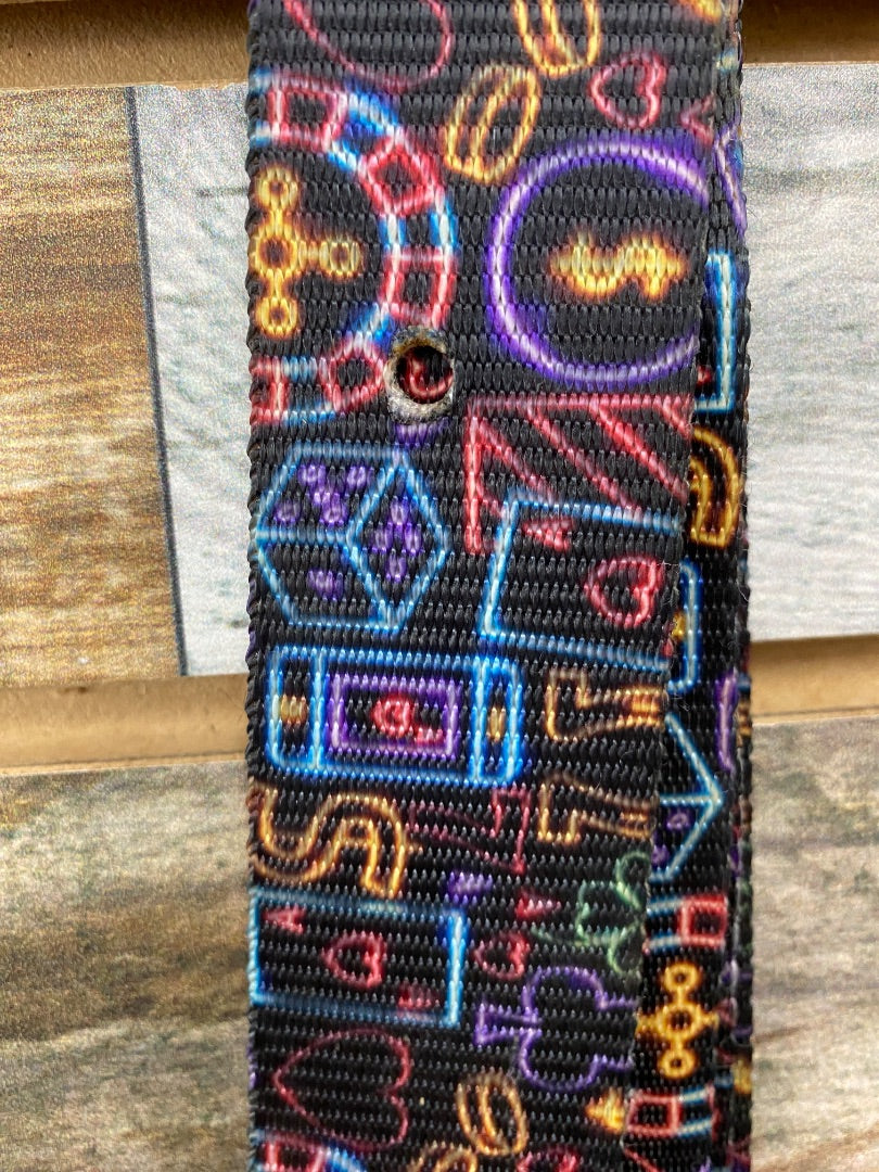 Matching nylon litigo and off-billet straps in neon sign pattern. Lightly used, some fading.