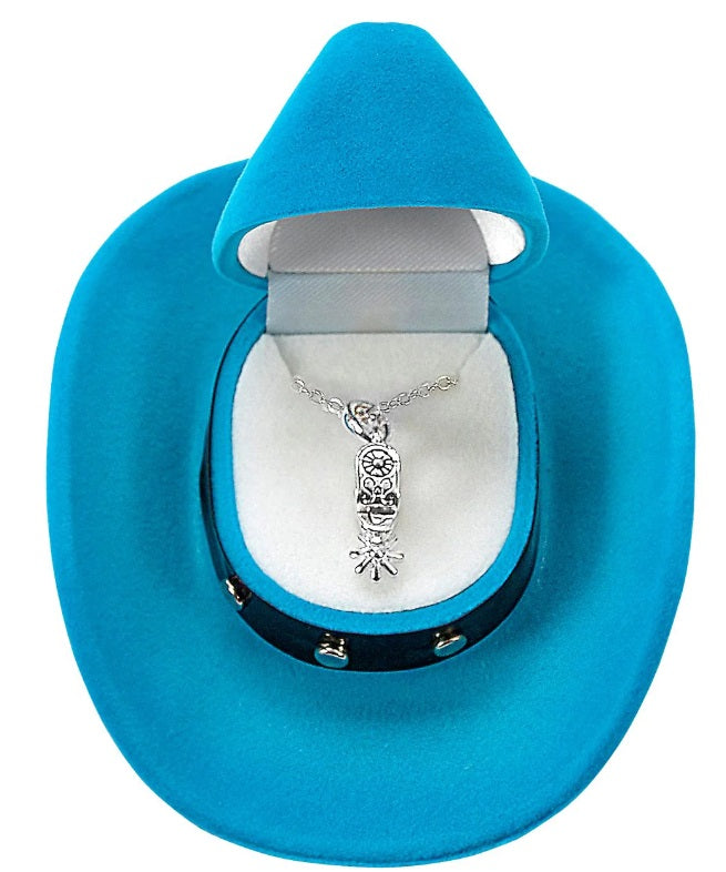 "Child safe" silver-plated Western Spur necklace packaged in colorful, velour cowboy hat boxes.