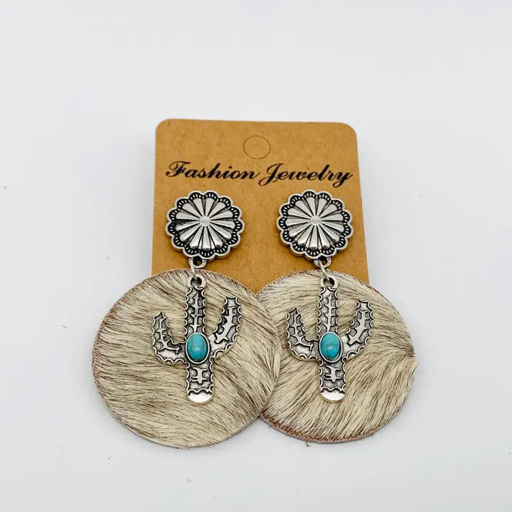 Western Style Cactus Animal Skin Double Charm Earrings are a trendy accessory that combines the elements of cacti and animal skin patterns.  These earrings feature two charms, one in the shape of a cactus and the other showcasing a unique animal skin design.  The combination of these elements adds a touch of western flair and style to your look.  Perfect for those who love to embrace their adventurous side and make a statement with their accessories. Material: leather, artificial horse hair, alloy, synthetic turquoise, steel Post style: cactus size: 2.4inch/62mm